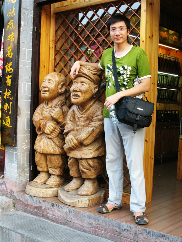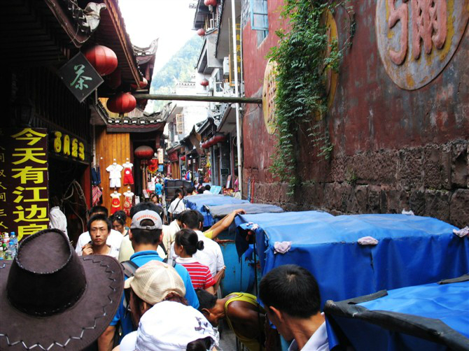 泛舟沱江是比较好玩的项目,不过前往坐船的码头还有一段距离,于是拉车的就有生意了。车夫在这么小的巷子里拉着车跑,边跑就边喊着让前面的人让开,不过他们都比较熟练了,也不会撞到人咯。