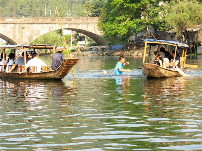 其实泛舟沱江的距离很短,就是从码头一直到下游的桥那边打个来回而已,但如果加上打水仗的话,那就有意思多了。前面那艘船的胖哥索性跳进水里去了。为了保护相机,我把它收进了包里。在随后的打水仗过程中,我浑身都湿透了,但也玩得挺过瘾的。