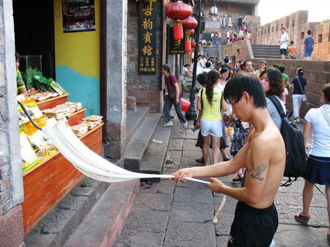 吃了过午饭,我们就开始游览起凤凰古城来。凤凰古城给人的整体感觉还是有那么种历史感和民俗感,不过放眼望去,全是游客和商店,商业氛围很浓。这里有很多卖姜糖和银器的店子,不过导游说有姜糖最出名的是张记的,银器最出名的是老凤祥的,选这两家的就不会买到假货和伪劣产品。
