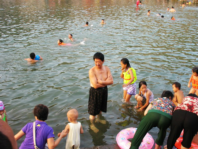 来到沱江边上,看到不少游客在江中游泳。一个个都玩得挺开心的。
