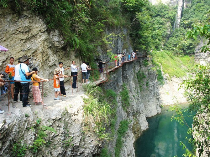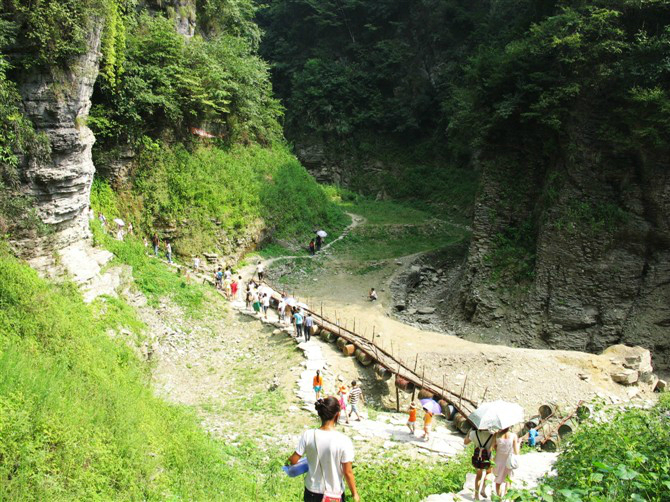 进谷要走一段看起来比较险的路,这是在岩壁上搭起来的悬空的竹板路,踩在上面感觉挺悬的。