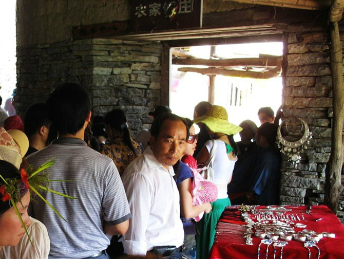 来到吃饭的地方,门口两边摆满了卖首饰的摊子。进门则要先对歌。我们一行人一起合唱了《桃花朵朵开》,然后喝了碗甜酒。