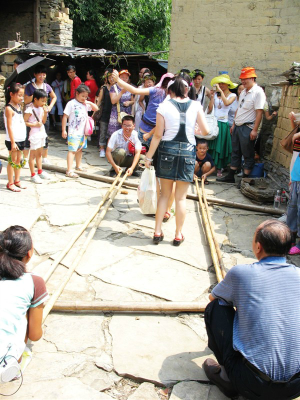 导游说苗家进门有三大忌讳,一忌踩门槛,二忌屋内打伞,三忌吹口哨。苗家的门槛越高表示地位越高,踩门槛是对主人的不尊重,此外进门要先迈左脚。“吹口哨”苗人认为会招鬼进屋。“屋内打伞”比较好玩,苗家屋内打伞是女儿出嫁才做的,如果男客人屋内打伞就表示想入赘,但要在岳丈家干三年苦工,女客人屋内打伞就表示想嫁入。据导游说,有个女游客到寨主家,由于不熟悉苗语,对寨主说“我爱你”,于是寨主就热情地把她留下,直到最后一班车要开了才放她走。