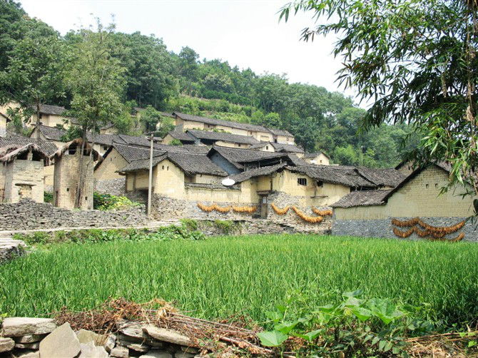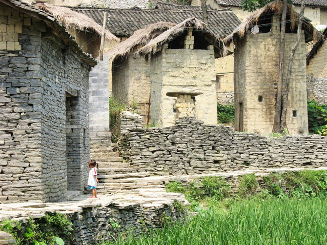 饭后,我们前往寨主家参观。苗寨的房屋大多就是用天然的石块和土砖建的。