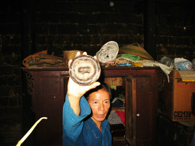 寨主还把收藏在柜子里的东西拿出来给我们看,比如有印有国民党青天白日旗的盒子等等。他还拿出一个铁疙瘩,说他也不知道这是什么东西,以前有2个,后来被河南游客偷走了一个。