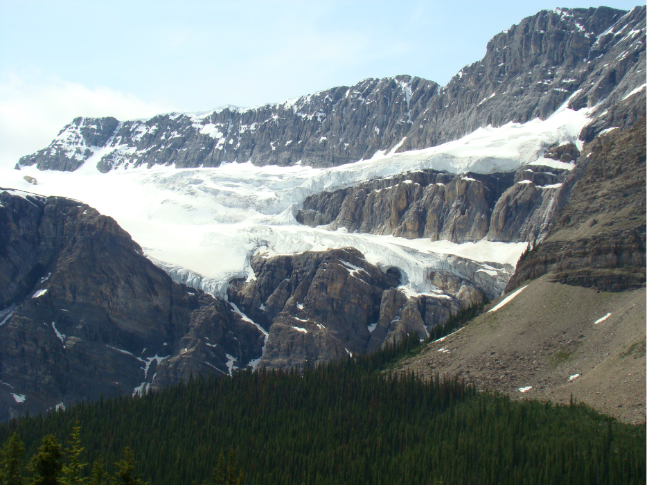 乌鸦爪(Crowfeet) 冰川。看介绍,过去是三个爪趾,但由于山体坍塌和冰川融化,现在只有两个爪趾了。大概不是很久以前的事,若不然怎么会知道呢?