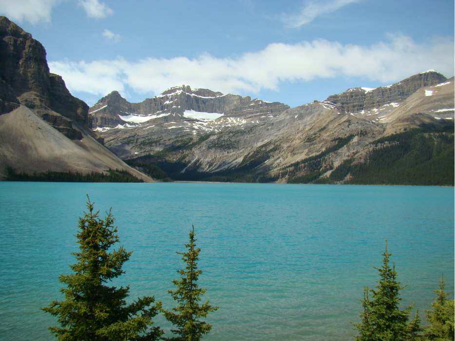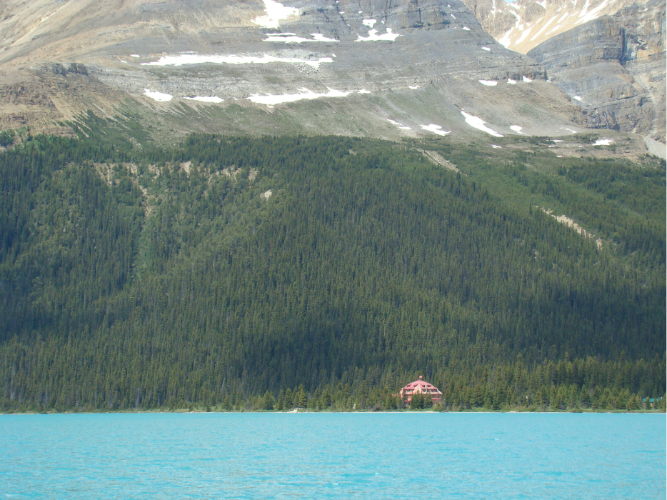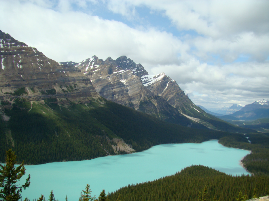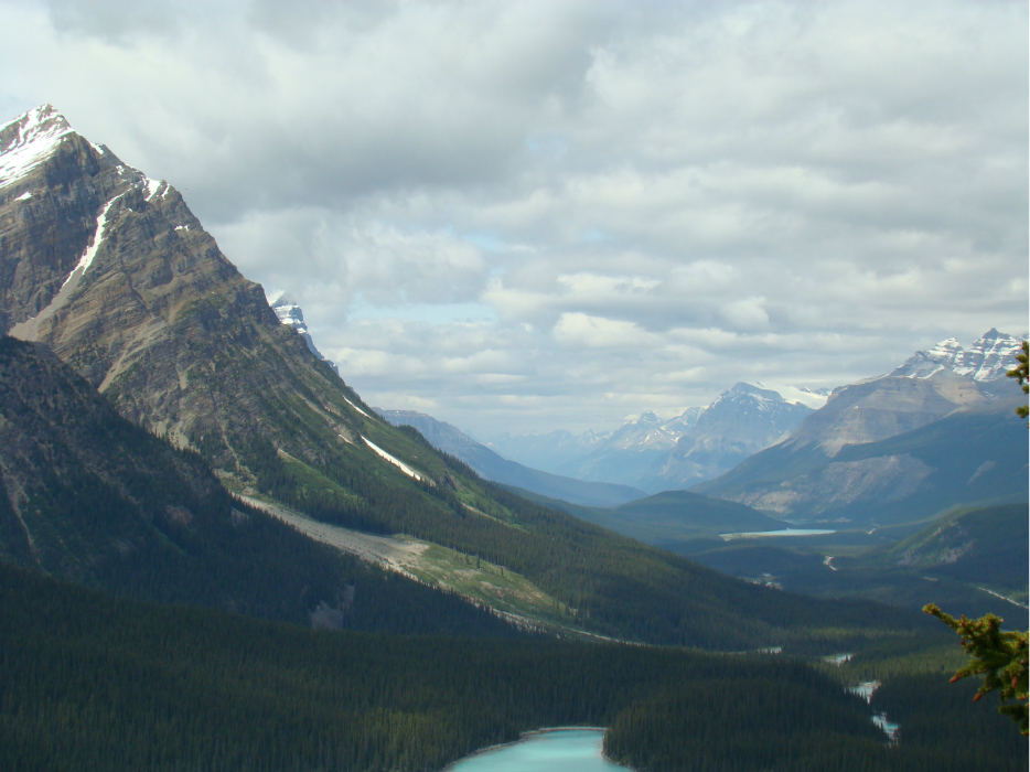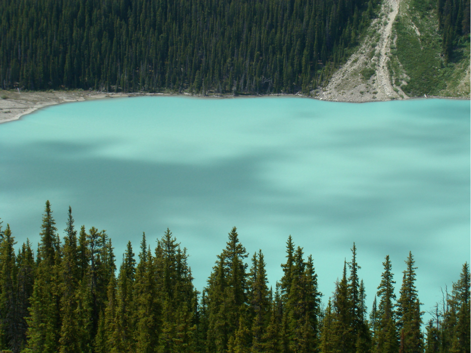 披头(Peyto) 湖,在一座山后的峡谷中。爬这个山要有较长的一段路。这个湖出名是因为它那个有点儿诡异的颜色。像一片蓝绿色的玻璃,静静地躺在山谷中。