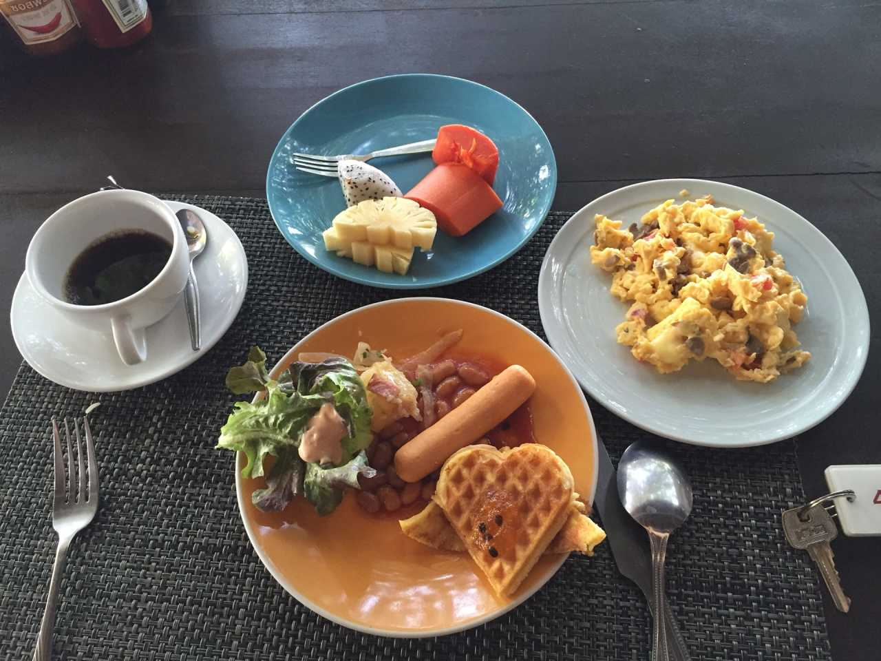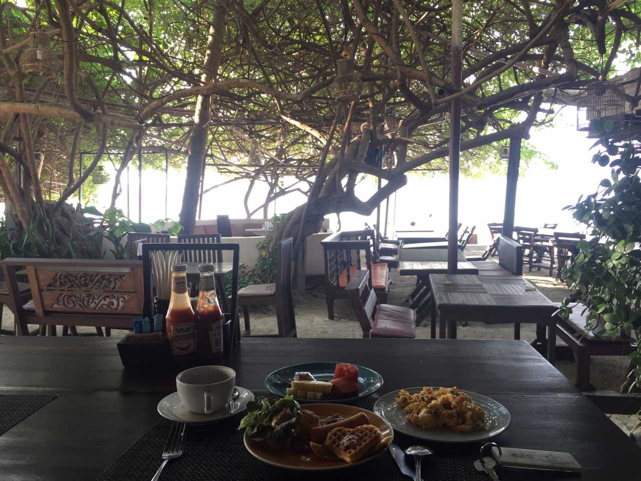 不管了,先去吃个早饭,我们可能起太早了,8点多去饭厅都没什么人呢,早餐品种也挺丰富的,有一些泰式的炒饭,木瓜那是相当甜,我们选了一个面朝大海的景观位哈哈哈,吃着美味的早餐吹吹海风,好惬意治呀