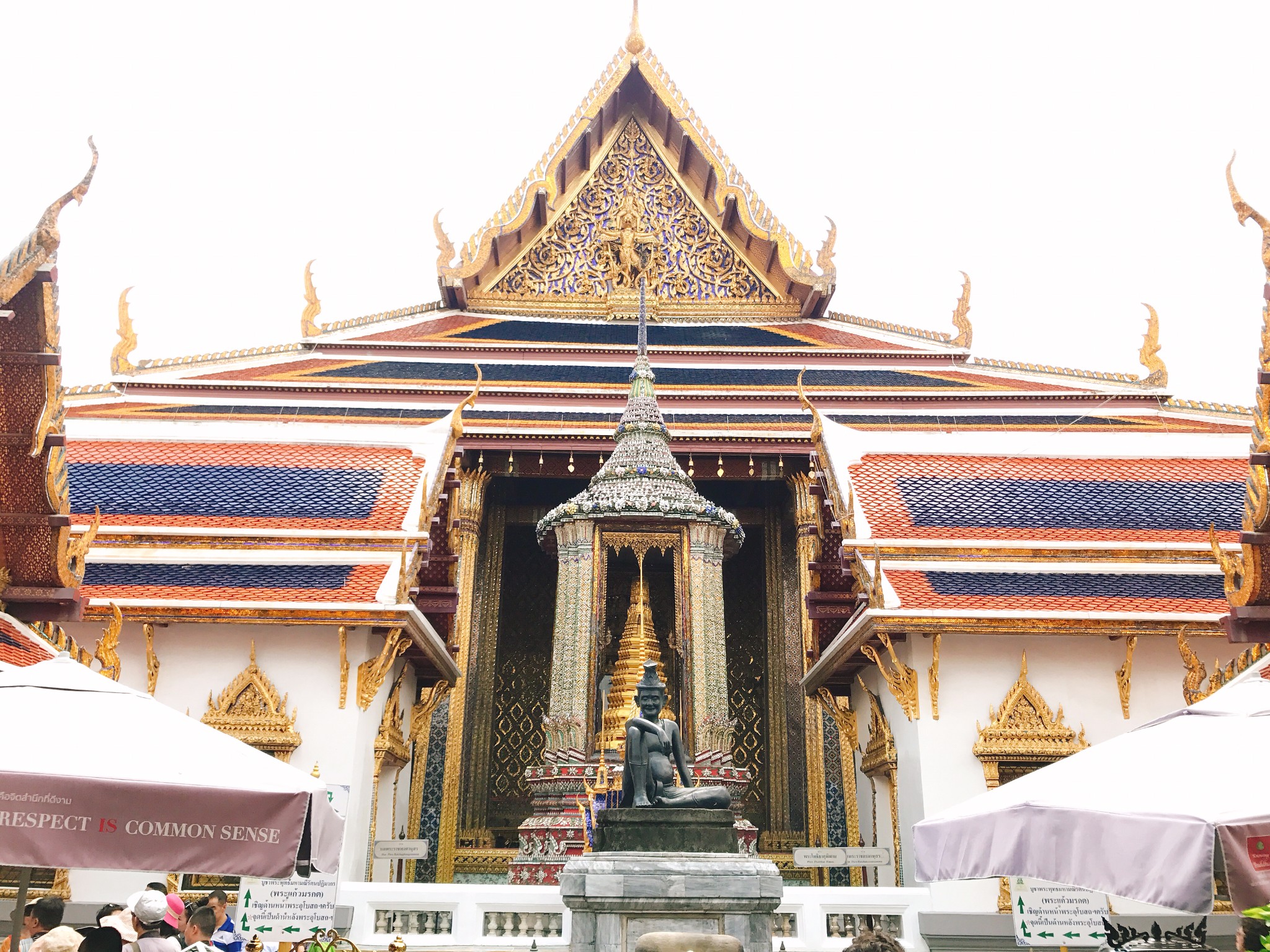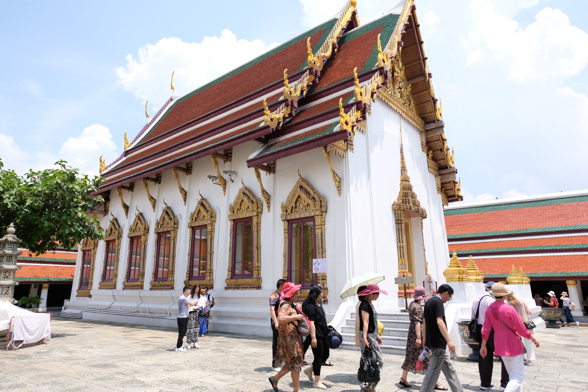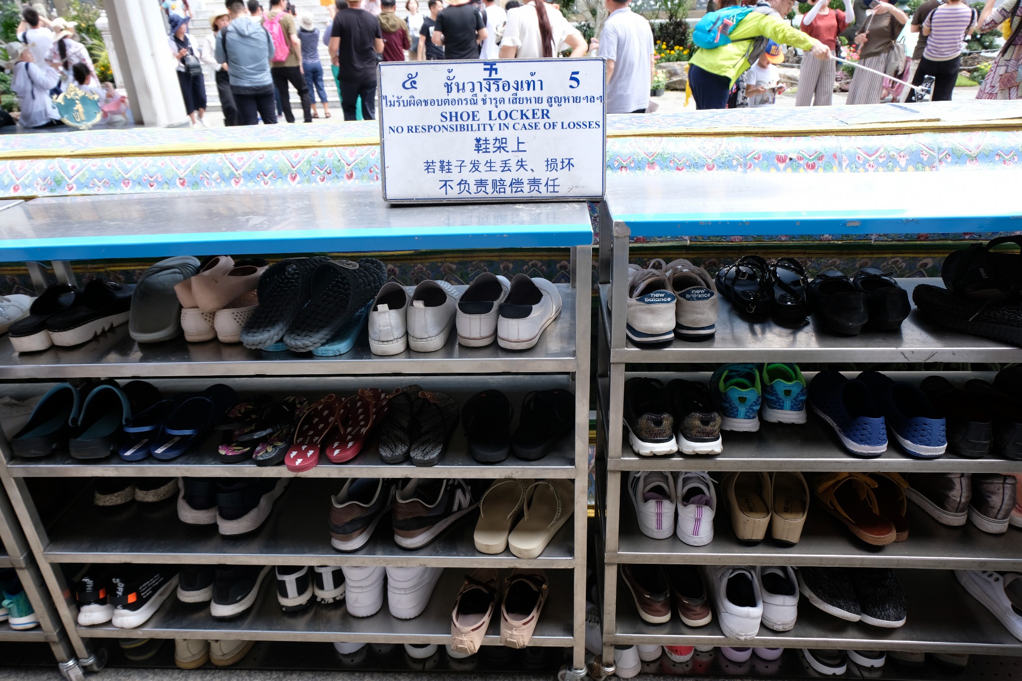 如果穿短裙子、无袖,不过膝盖的衣服,会被拦下来,需要包裹严实了才给进来。进去里面参观,需要脱鞋,泰国的地板是很干净的,请放心行走(虽说不用怕脏,但走了之后袜子确实是脏的,一定是别人的袜子把地板踩脏