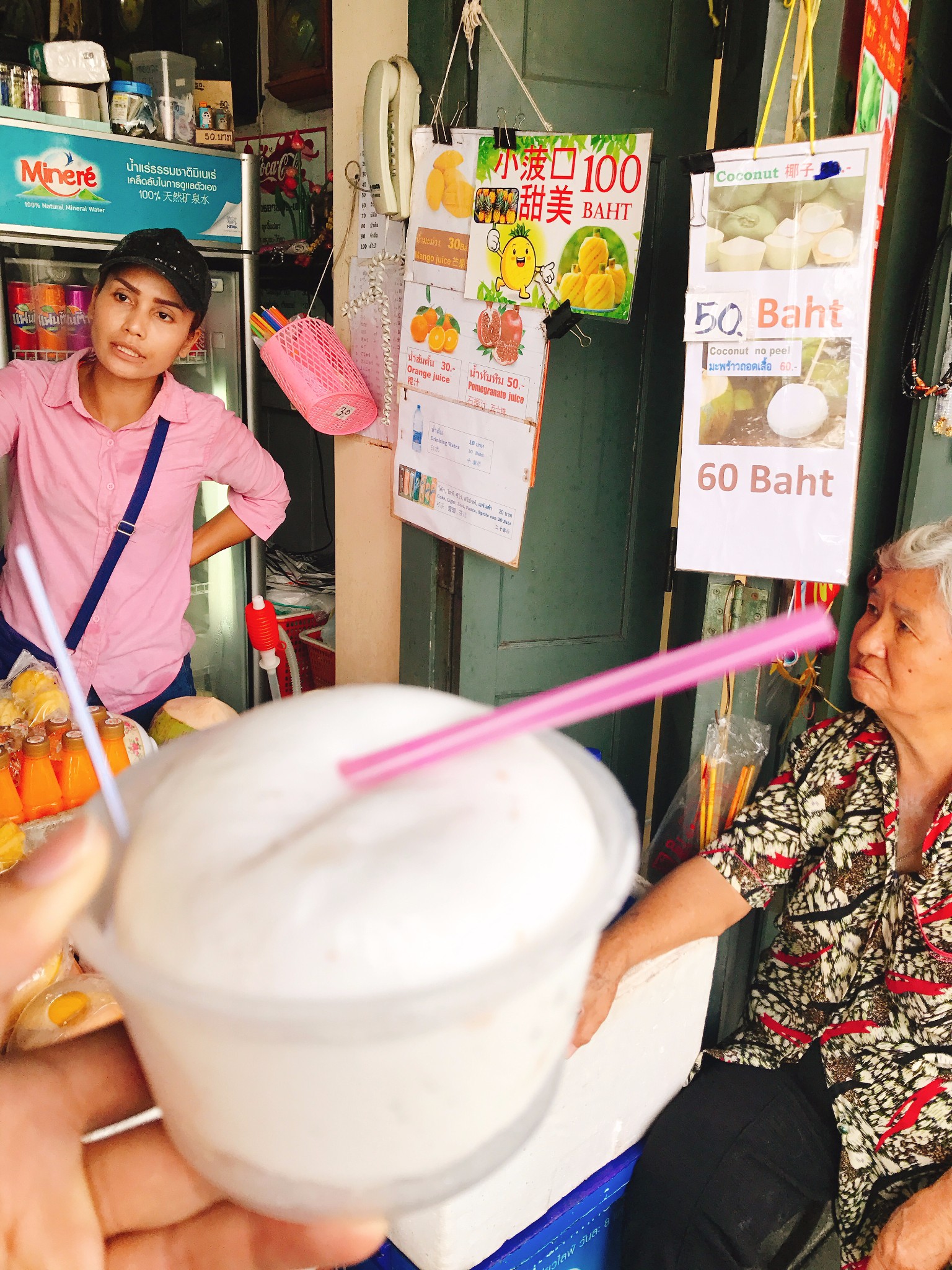 泰国锋味的那颗椰子一直留在脑袋里!当时看电视就觉得超厉害,好可爱,又神奇,半个开椰子高手的我下次也要开这样子的椰青!里面是清甜的椰汁,由嫩滑但柔韧的椰肉包裹着,吸一口清凉,椰子就瘪了些,再吸,再瘪,知道把水吸干,再咬那层椰肉,巨好吃!