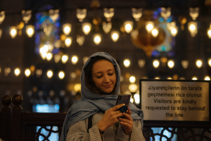▲苏莱曼清真寺一个俄罗斯女游客正在微笑的欣赏自己美美的自拍瞬间