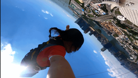 觉得自己可能在空中翻了几翻,然后开始感受自由落体的美好。因为紧张忘记拉绳所以自己大头朝下降落的,直到看见在下面接我的小哥哥长得有点像欧洲吴彦祖我才后悔,毕竟这个角度有点像从头顶上掉下来一条五花肉吧···