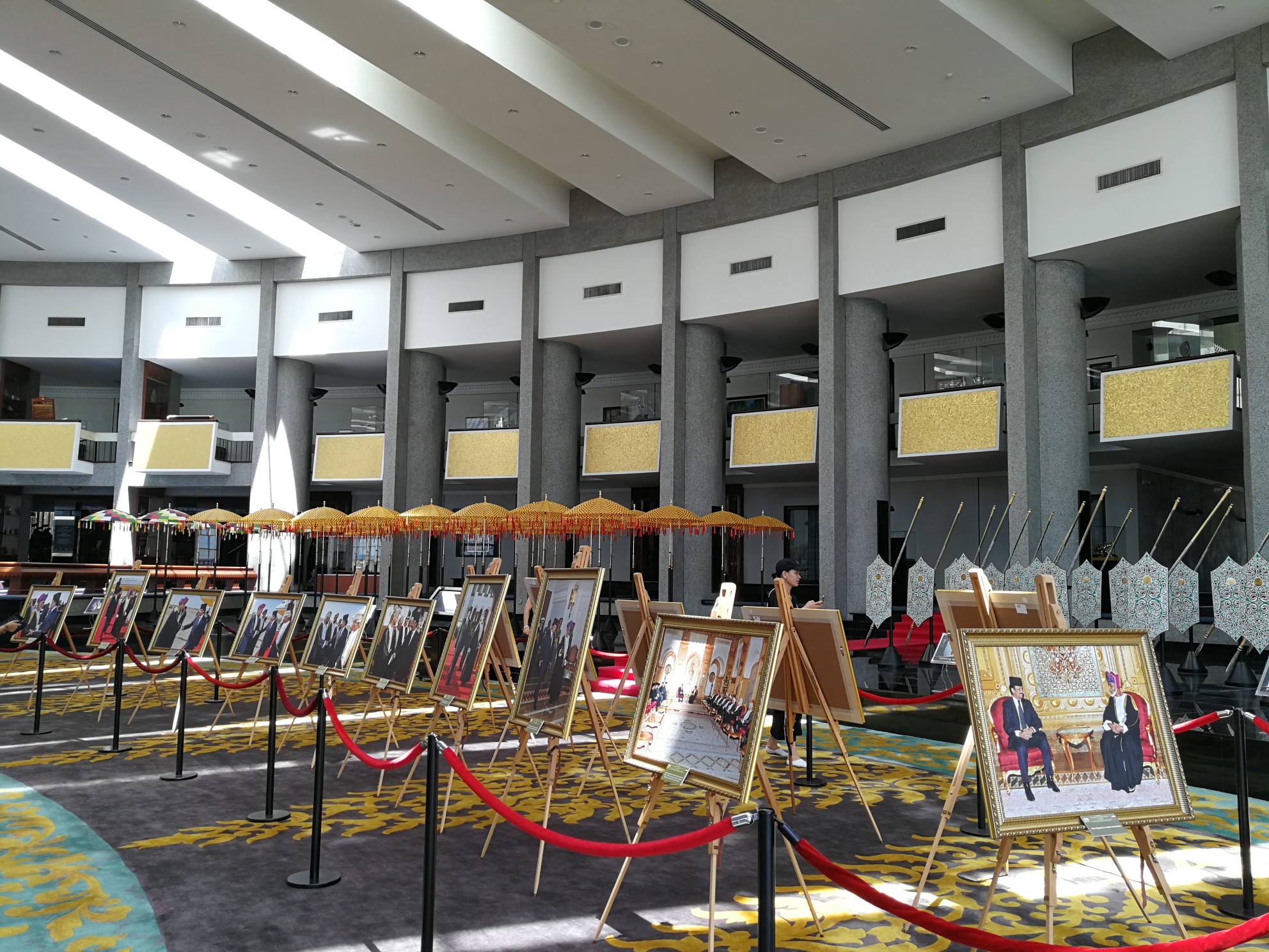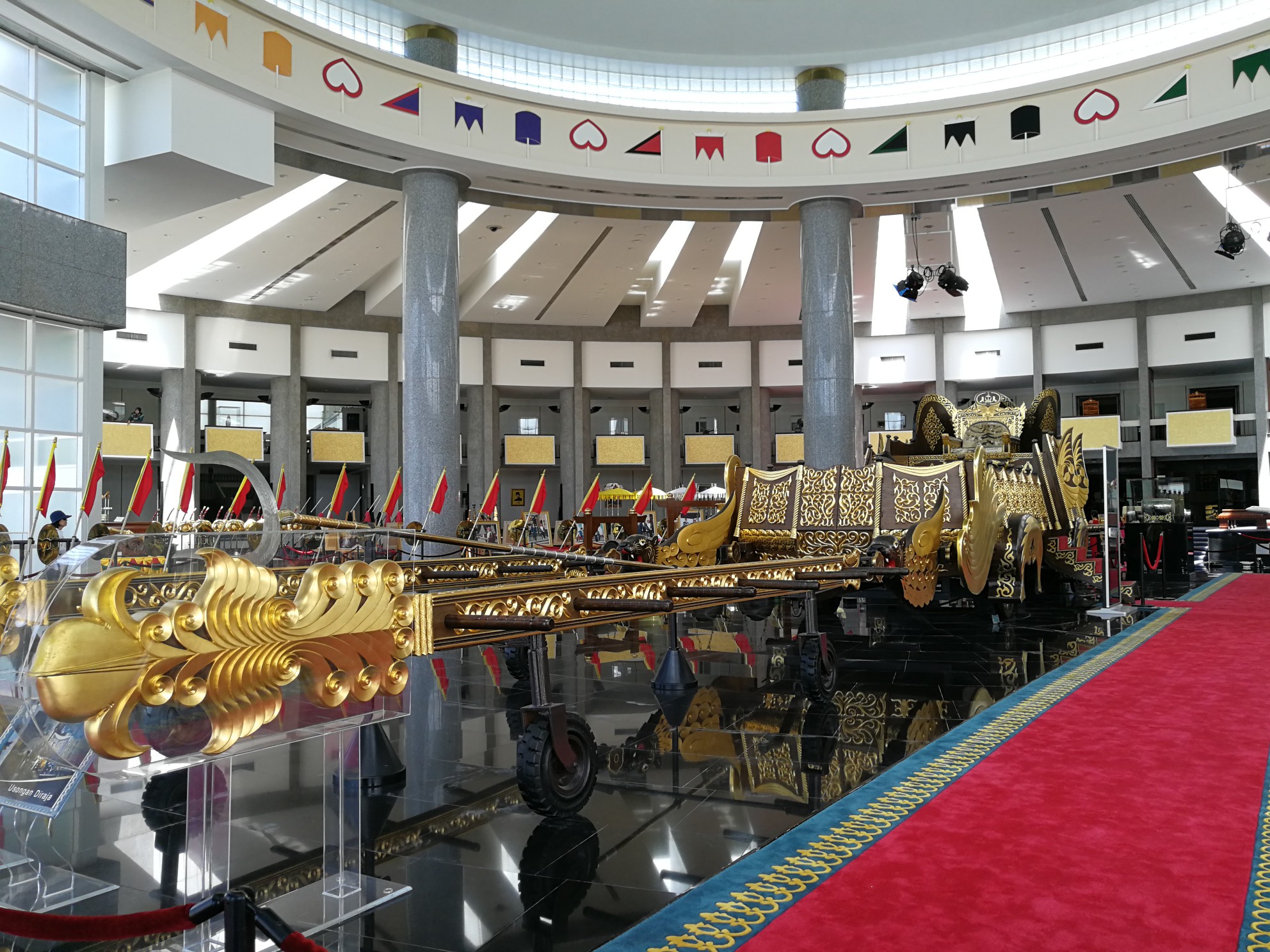 大厅内陈列着苏丹1968年登基大典中的各种御用品,其中最显眼的莫过于苏丹登基时乘坐巡游的人力龙辇。这辆车是敞篷的,据说当时巡游国王也硬是顶着烈日晒了几个小时。后来,为庆祝苏丹登基25周年所建的第二代人力龙辇就有经验了,增加了顶棚还装了空调,摆在里面大厅,不让拍摄。