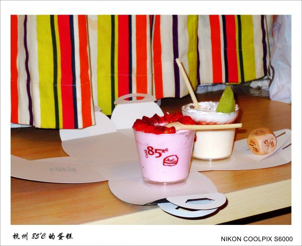挨着面馆不远有一个蛋糕店,回酒店的时候顺路晃进去买点甜品,意外发现这里的北海道起司做的挺好吃,细腻的味感,甜度刚好。第二天忍不住又去买了两个小蛋糕,如果去杭州可以找找这家蛋糕店,名字很特别,叫85°C,听说是连锁的。