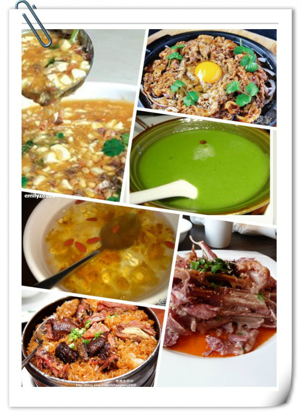 三对六人,占了一张台。我们零零碎碎点了六个菜,因为太饿了,没顾上照相,食物就进了肚子。下面这些图是在网上找的。但是,除了豆腐汤没有图示的美好以外,其它都相差无几。个人比较喜欢青豆泥、琥珀桃酱还有肥牛窝蛋饭,可能女生偏爱甜食的缘故罢,LG大人就对前两者无感。酱鸭对广东人来说偏咸了一点点,送饭还好。但价格真的超值, 115元买了单。