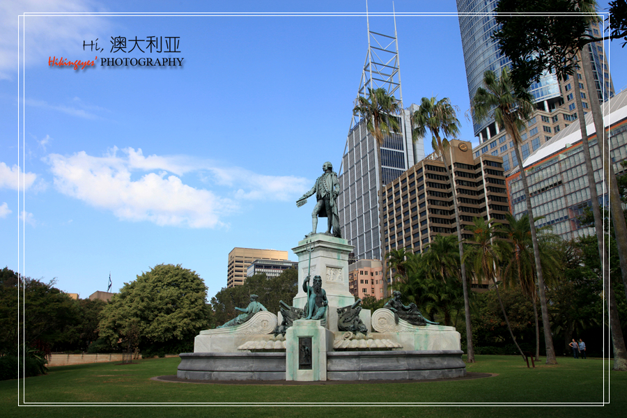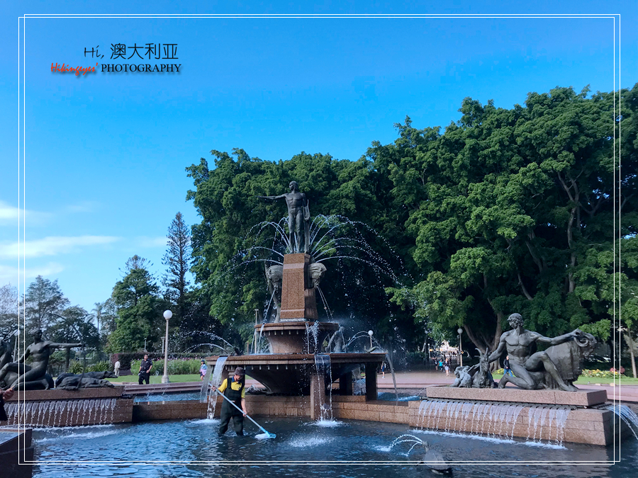 酒店离海德公园步行只有几分钟。海德公园初建于1810年,已有200多年的历史,这里有大片洁净的草坪,百年以上的参天大树。公园的中心是一个设计独特的喷水池,即阿奇博尔德喷泉(Archibald Fountain),中间高处的是一位手拿古琴的少年,水池里还有几组铜雕,这是1932年为纪念澳大利亚在第一次世界大战中的贡献而建。