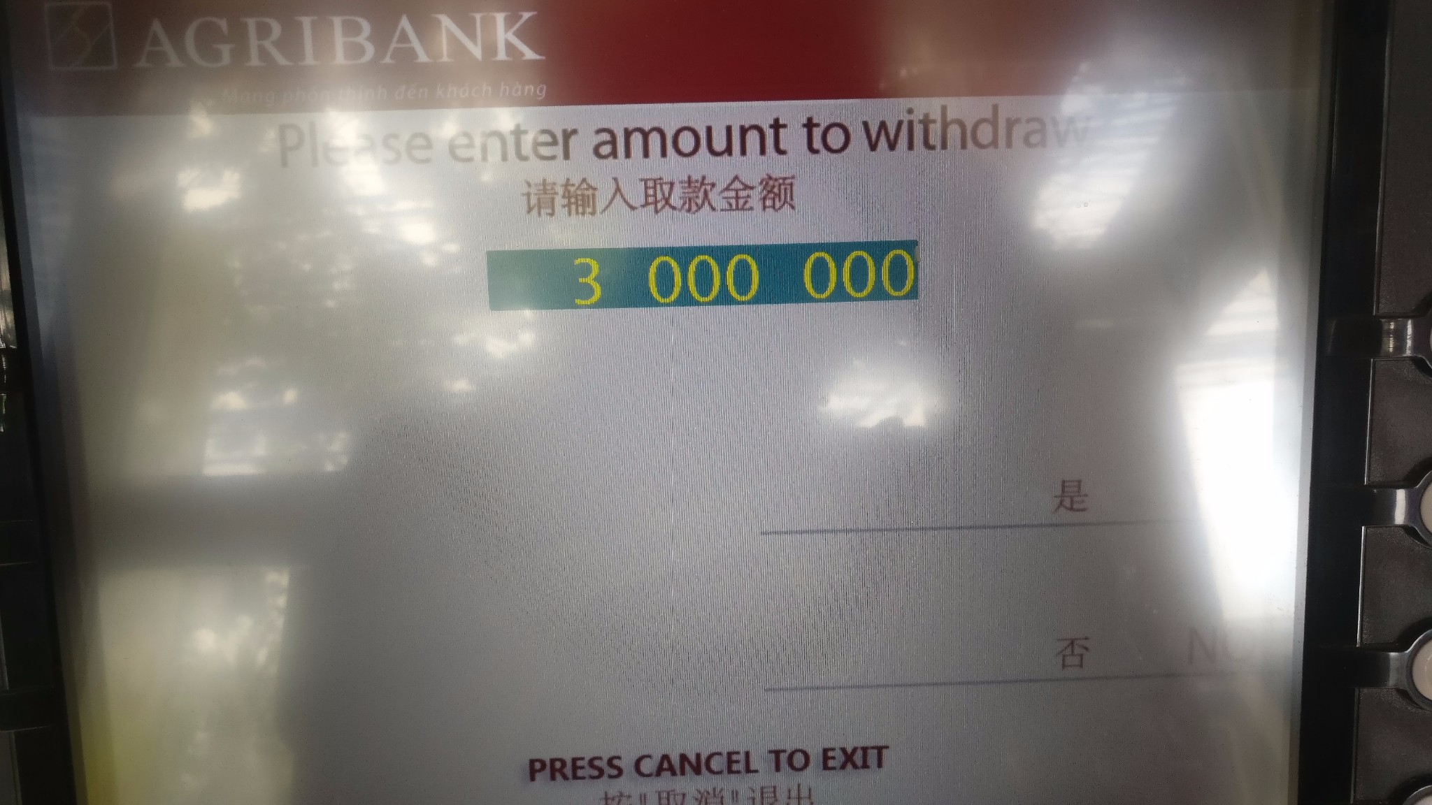 第五步:输入金额(越南取现最高金额300w越南盾,相当于人民币一次只能取出846元,有得银行只能去200w越南盾,但是建议一次取300w就可以,足够用好多天的了)