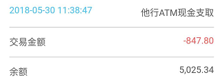 这是我用南京银行取现一次300w越南盾自动转换成人民币是847.80元。没有手续费