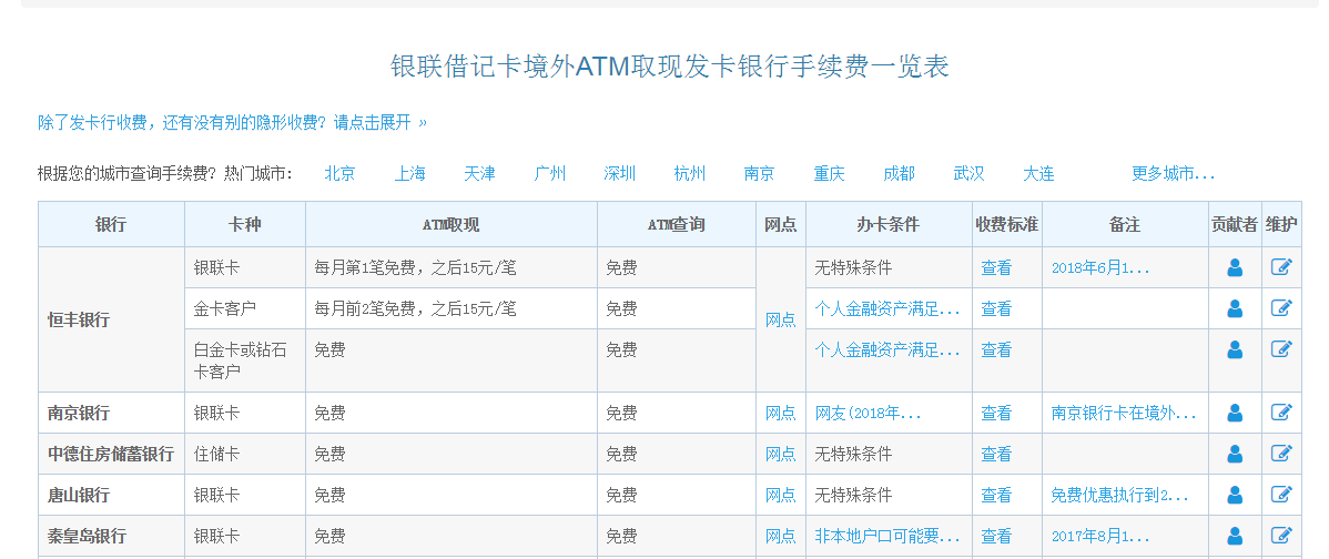 银联借记卡境外ATM取现发卡银行手续费一览表,这个表也可以知道你所有银行卡取现手续费价格!