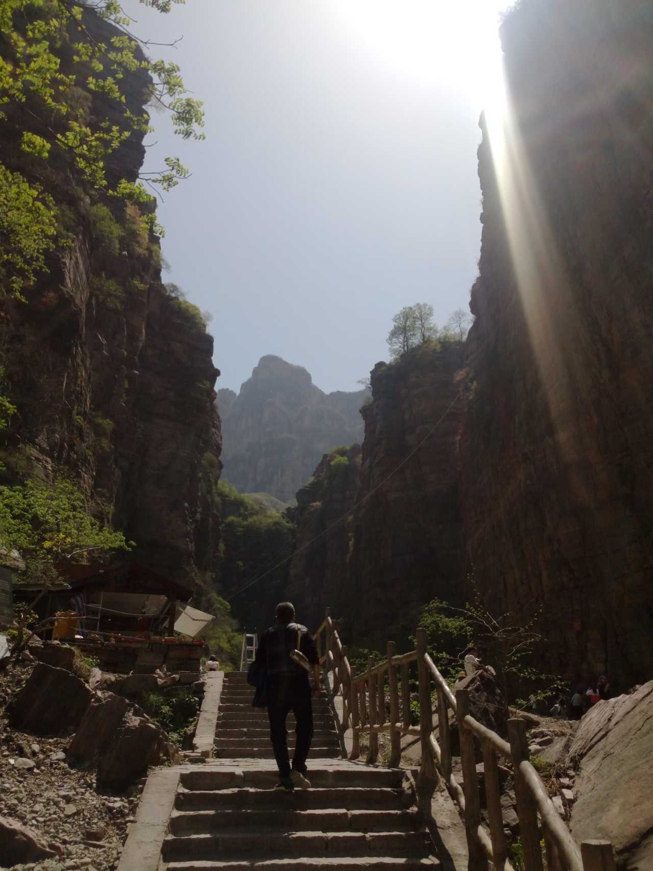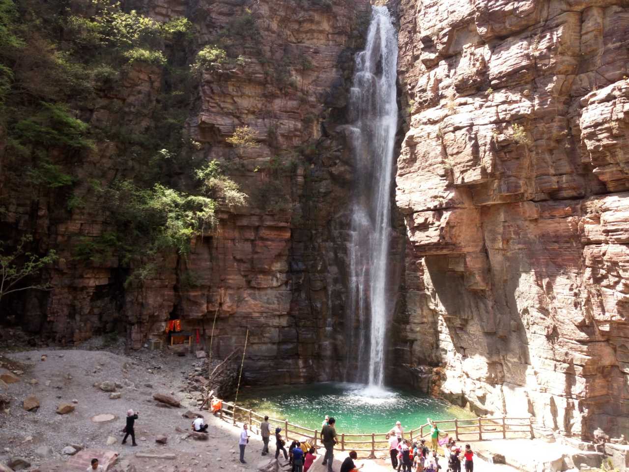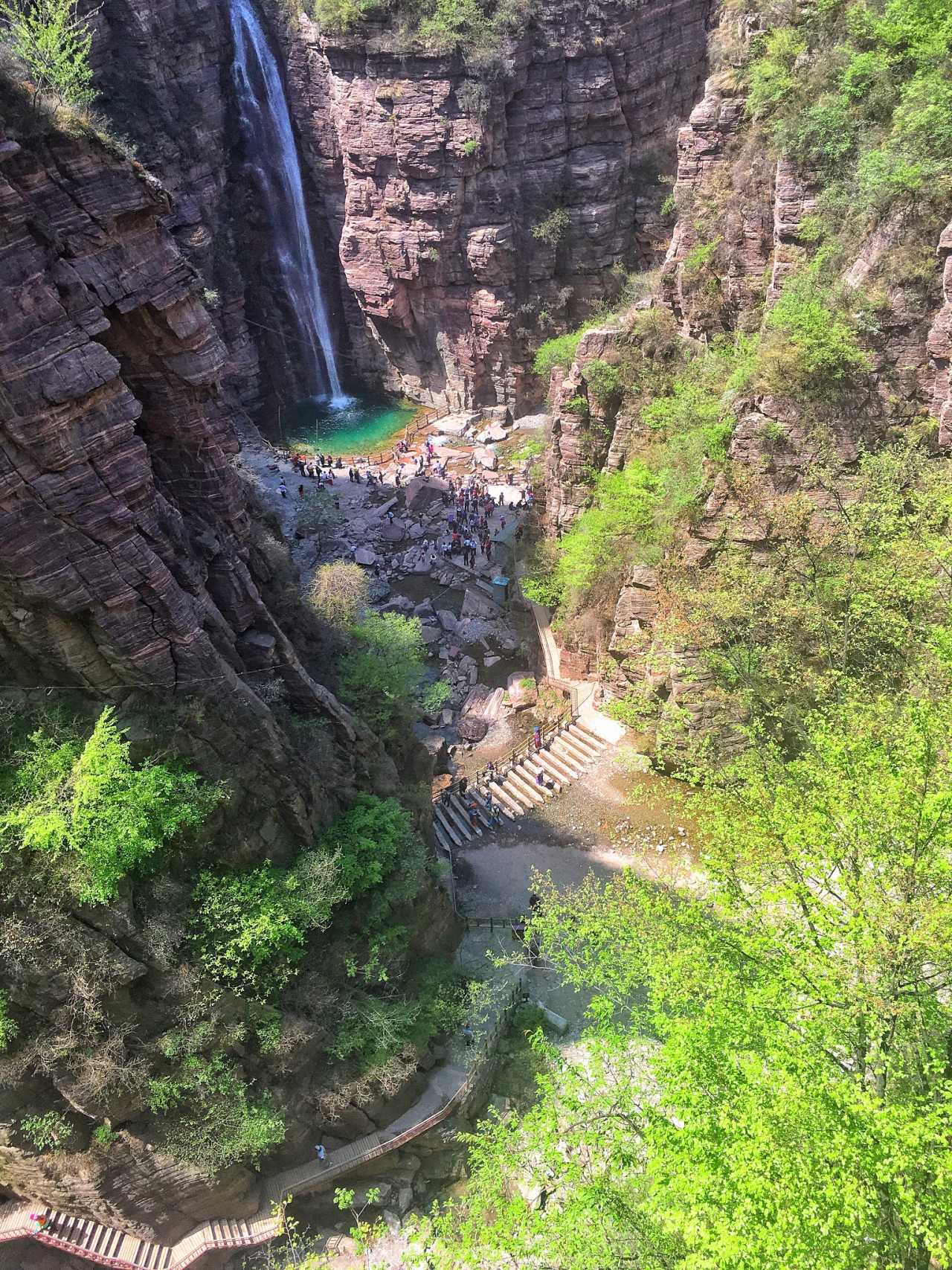 经过四个半小时左右到达万仙山,万仙山其实是一个非常大的景区,包含四大分景区,不过考虑到时间,我们选择的是黑龙潭和郭亮村,先去的黑龙潭,这里本来有收费的电瓶车可以上到山脚,结果那天有警察检查,不让电瓶车上山,我猜可能电瓶车是村里组织的,并没有经过审批。这里是太行山的一支,大多是古老的地层,沿途处处可见怪石嶙峋,不时可见很奇怪的石头,一个小时多点就走到了黑龙潭,老实说相对于南方的瀑布,这个这个瀑布有点细,不过胜在高度还不错,远看像红色岩石中间流淌的烟雾,流到潭底是碧绿色,倒也别有情趣。对于太行山脉,有这么一个水量的瀑布,应该也不是件容易的事。