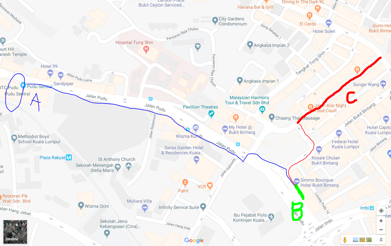 KLIA2的机场大巴在1层level 1 Transportation Hub Bus bay,下飞机朝着LEVEL 1的指示飞奔过去就行了,我们一路都是沿着指示走过去,每次去到KLIA2搭大巴的地方都要走一大段路,反正我是觉得很远,非要把沿途的商铺经过了才到买票搭大巴的地方。KLIA2可以去几个地方,还可以18马币直接去到预定的酒店门口,这次我们是去Pudu Sentral富都车站,费用:12RM--4人共48RM, 耗时约1hrs10mins, 步行至酒店。如下图蓝色A点是富都车站,绿色B点是住的酒店位置,红色粗线C点就阿罗街: