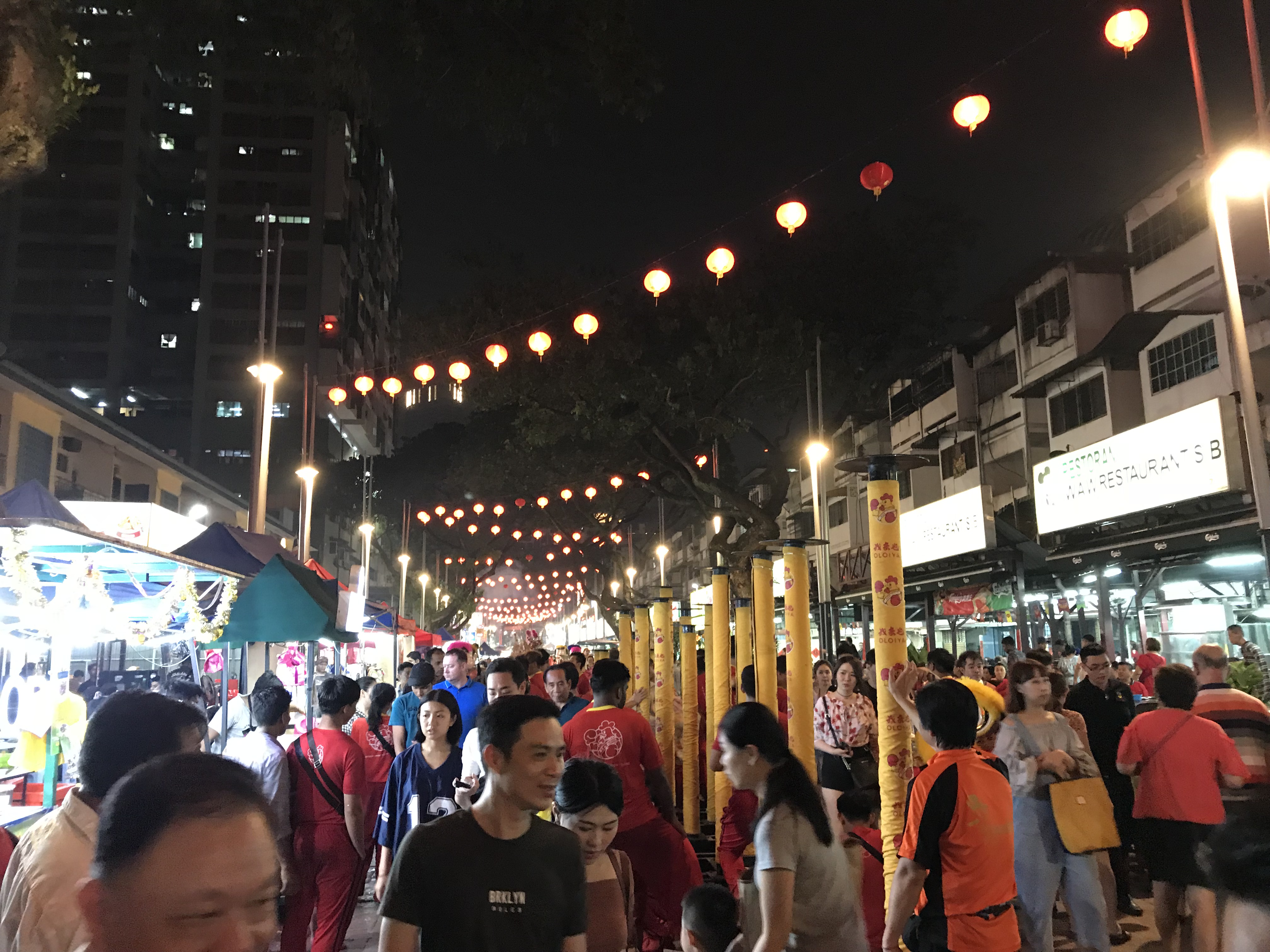 由于总是听说吉隆坡很多飞车党和抢劫党,抢不到东西会打人,本来就患有被害妄想,精神更是被绷得紧紧的,毕竟去到车站晚上11点多,还要走一段大约10几分钟的路才到酒店,下车前我把背包什么的绑带都收到最紧,扣好在身上,像疯子一般,密密麻麻地小碎步,一路冲向酒店…… 刚走几步,也不知是哪儿,放起了烟花,boom boom boom伴随着我们,看到烟花那一刻,有种莫名的感动,2018的元宵在异国他乡有了些许熟悉的味道。期间拿手机看是否走反方向,都得小心翼翼扫视周围有没有人,瞄一眼马上收起来。我原本以为一路上都会黑麻麻的,出乎意料的,一路上路灯亮堂堂照耀着,沿路的人行道都有围栏和屋顶,增加了安全感。但是其中没有围栏的部分,好像有一个摩托车总是跟着我们,赶紧加快脚步走到有围栏的地方,我就直勾勾地盯着他,直到他远去……… 快到酒店前看到附近好像有夜市。