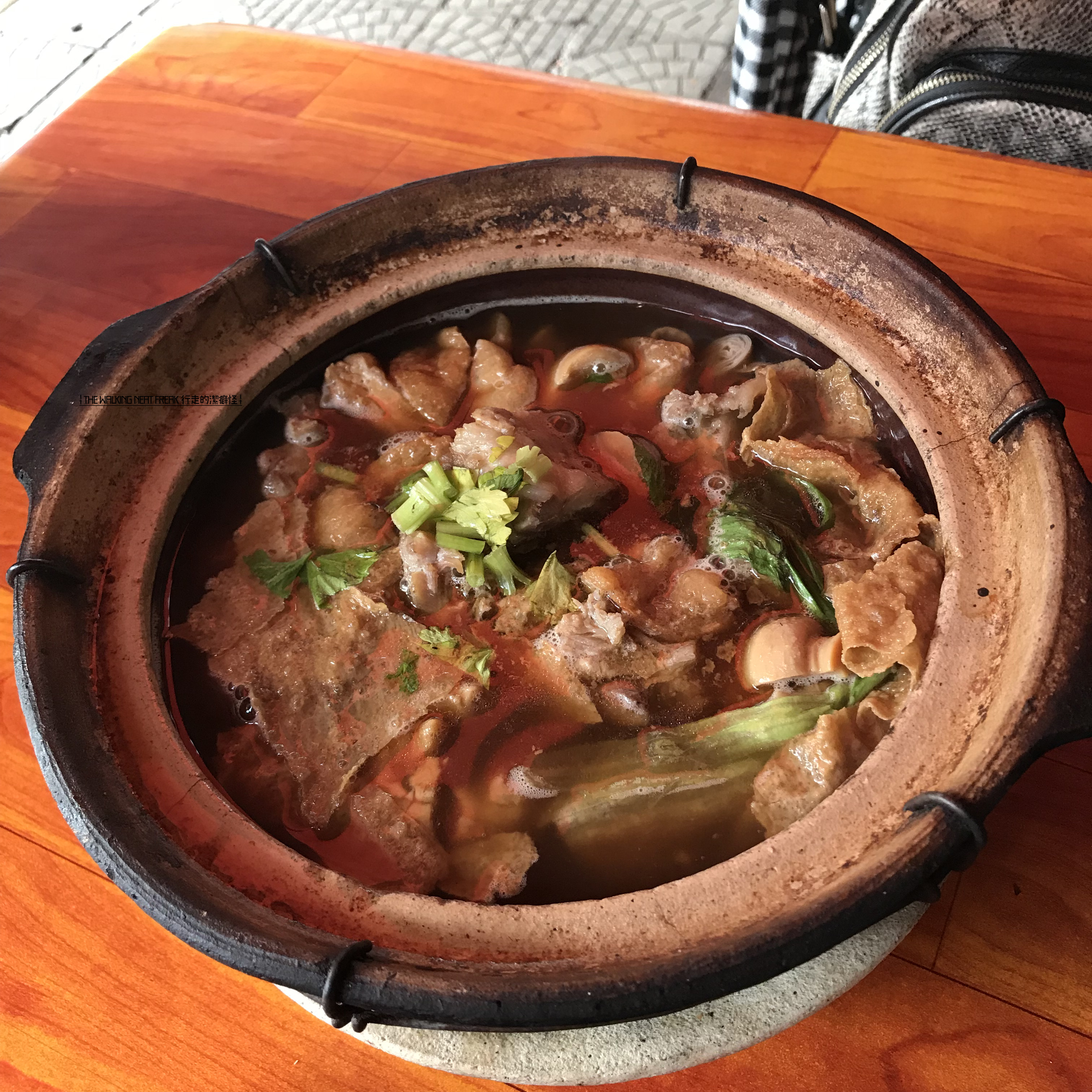 我们随便进了一家门面简单,但是仿佛很多本地人吃的小店,小店的门口不算小,只是上图一直有辆车挡了一半门口,但是里边就算是大白天,感觉还是蛮暗的,怕黑不溜秋拍照不行hahaha,就选了门口旁的座位坐下了,一是比其他位置亮多了,二是坐在风口吹风也许没里边那么闷。既然店名就叫肉骨茶鱼头煮粉,我们就各点了肉骨茶和鱼头煮粉,问喝什么有冰水和薏米水可选,就点了4杯薏米水。薏米水先上来,味道和想象中不一样,我觉得有点咸,Tony和小马抿了一口就喊好难喝,从此一口没碰过。我觉得虽然味道有点怪,说不上好喝但不至于到抗拒,看到很多人都点,应该是常规消暑清热解毒饮品吧,因为到后来发现很多地方的饮品选择中几乎都有薏米水。等了一小阵子,两锅主角上来了!感觉分量还是很足的,而且,鱼头煮粉的汤真的超级鲜,好好喝!手忙脚乱地吃了起来~~