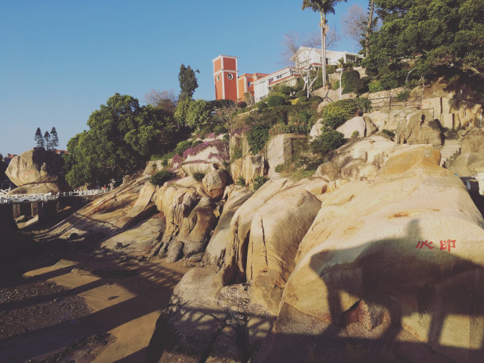 离开沙滩后一直往前走就是大名鼎鼎的日光岩啦。要上日光岩首先得经过一座庙,大家可以顺便在庙里拜一拜再上去。登日光岩的沿途中可以看到非常漂亮的海景,大海映衬着岛上的各式建筑简直像是电影里的画面。到了日光岩顶上可以看到全岛的风光,还可以遥看陆上的风景,对于我这个很少看到海的人来说真的非常的壮观。