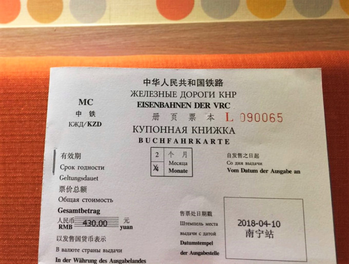 从深圳坐动车到南宁,火车站买南宁-河内嘉林的车票,一天一班,北京时间18:05发车,越南时间次日5:30到达。国际车票12306买不了,需要在南宁火车站窗口购买,售票员检查护照和签证后会开一个票本