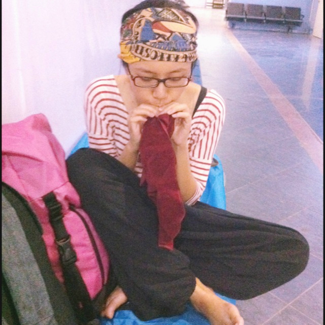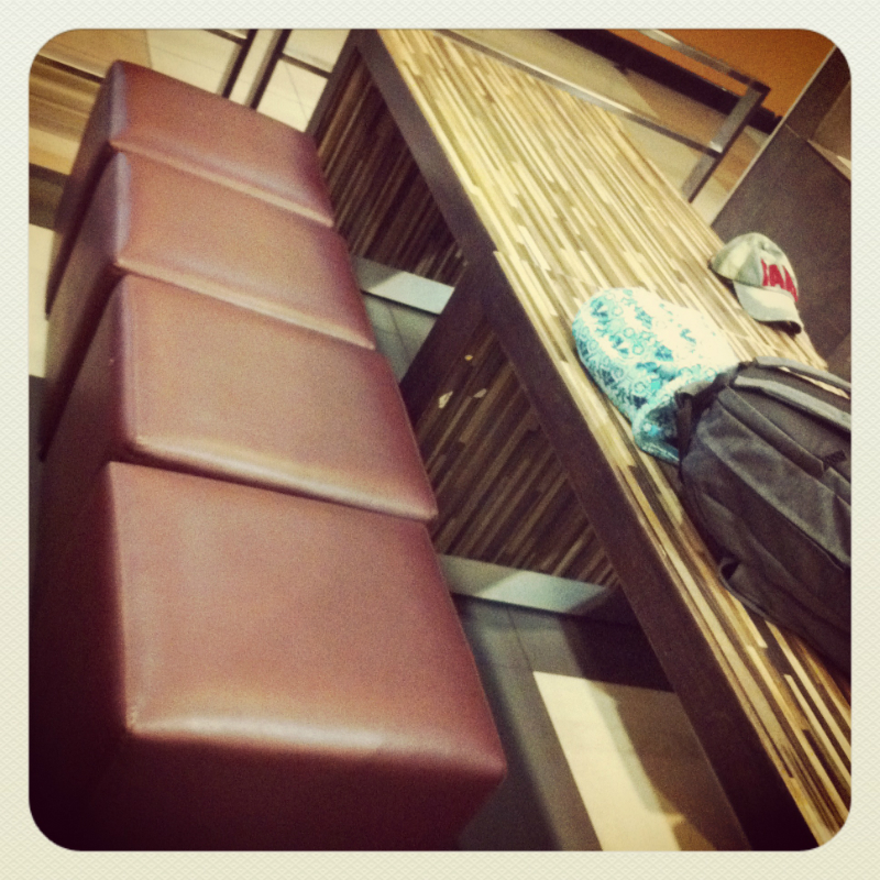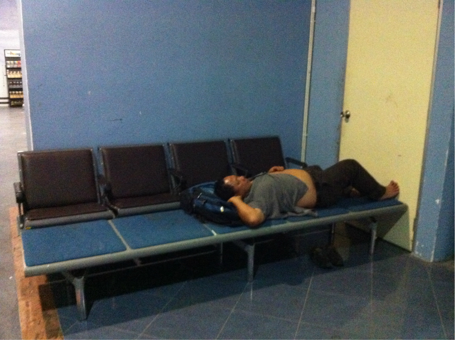 许是因为经历了赶飞机事件后上帝对我们略有歉意,RP在此时有了短暂的小爆发——就在我们准备往硬凳子上躺下的时候,眼角突然喵到了右边手原本躺着人的两排方形皮沙发空了!两人箭步上前,光速拿下皮沙发,小布袋 当枕头往那一摆,双眼一闭,嘴角扬起胜利的微笑。