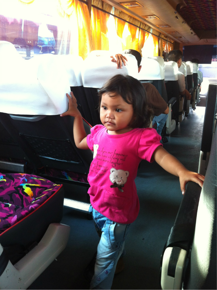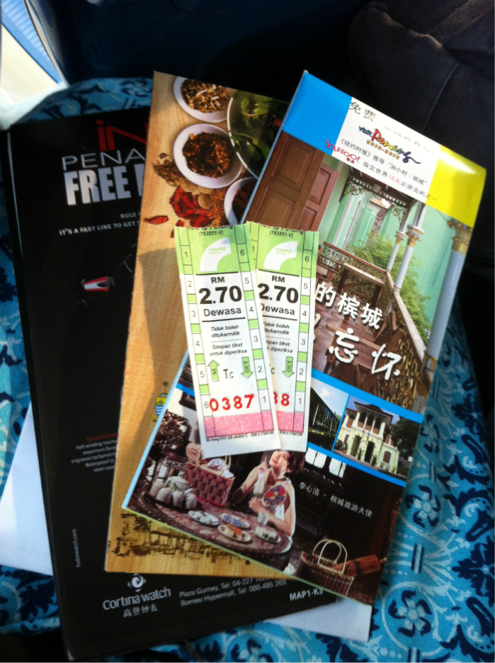 等了大约10分钟,坐上了401E。司机会按照不同的路程进行收费。因为我们要到爱情巷,所以2.7RM一人,需要自备零钱。槟城 的巴士分两种,一种是收费的巴士,一种是免费的乔治城观光巴士,后者只在乔治城内才可以搭乘。