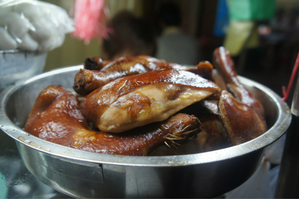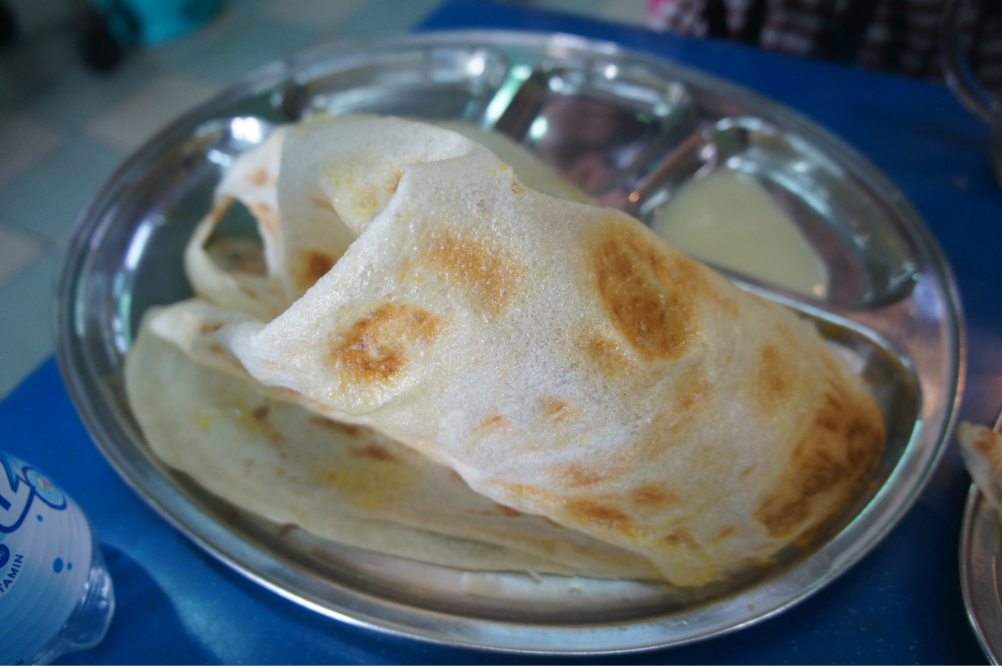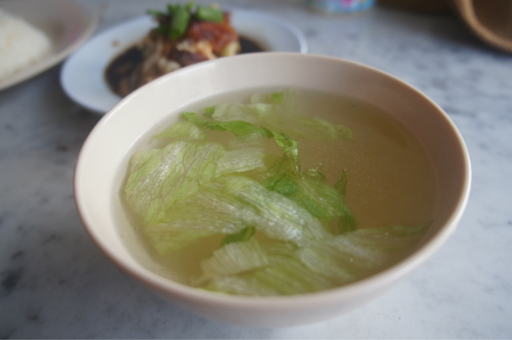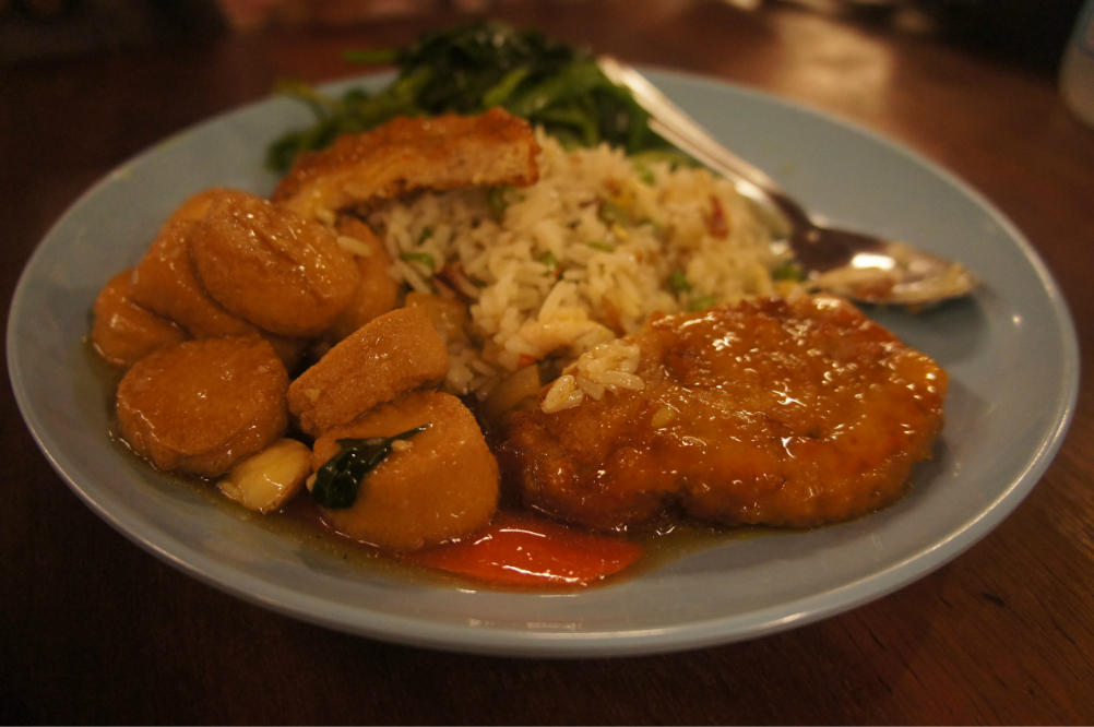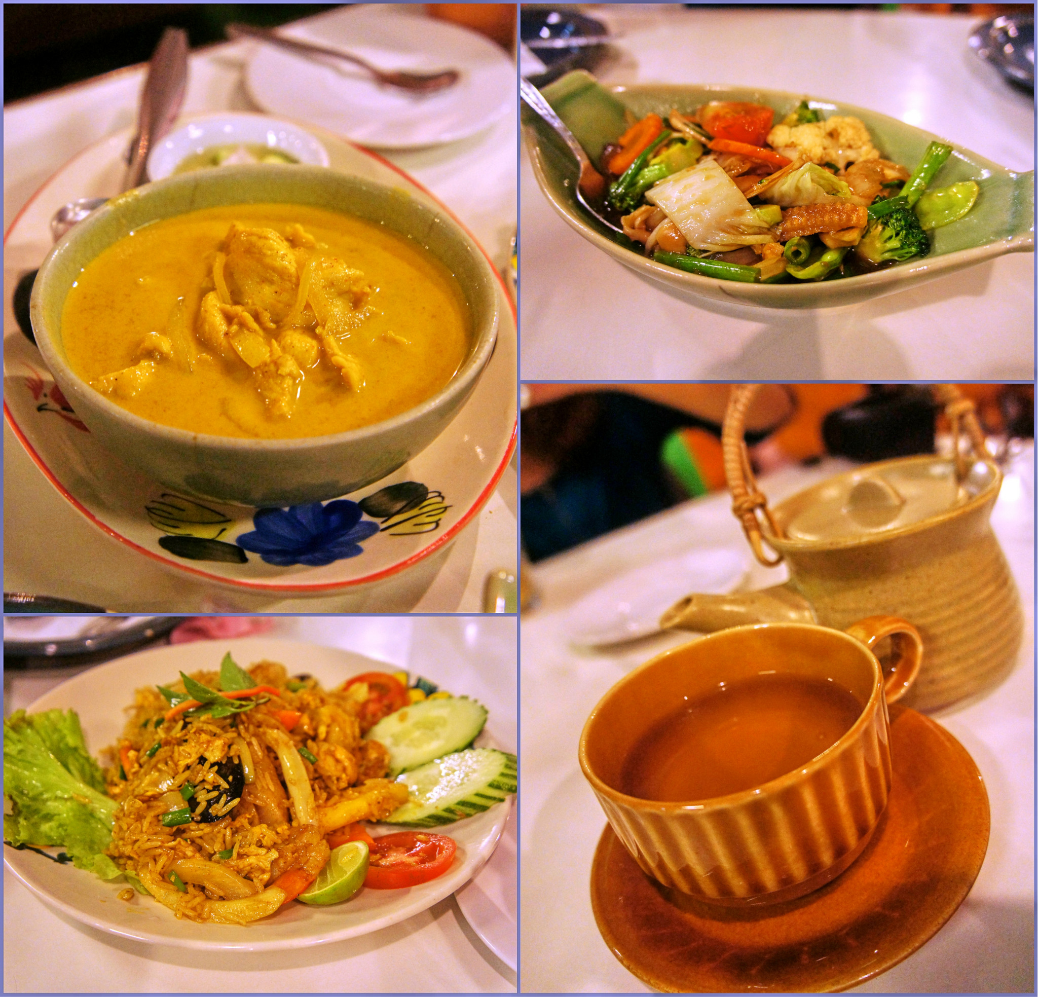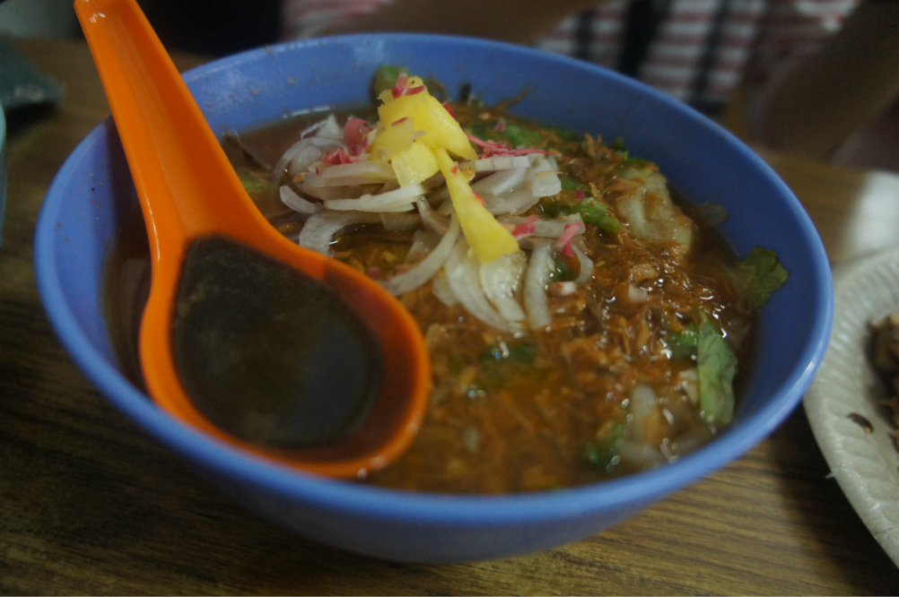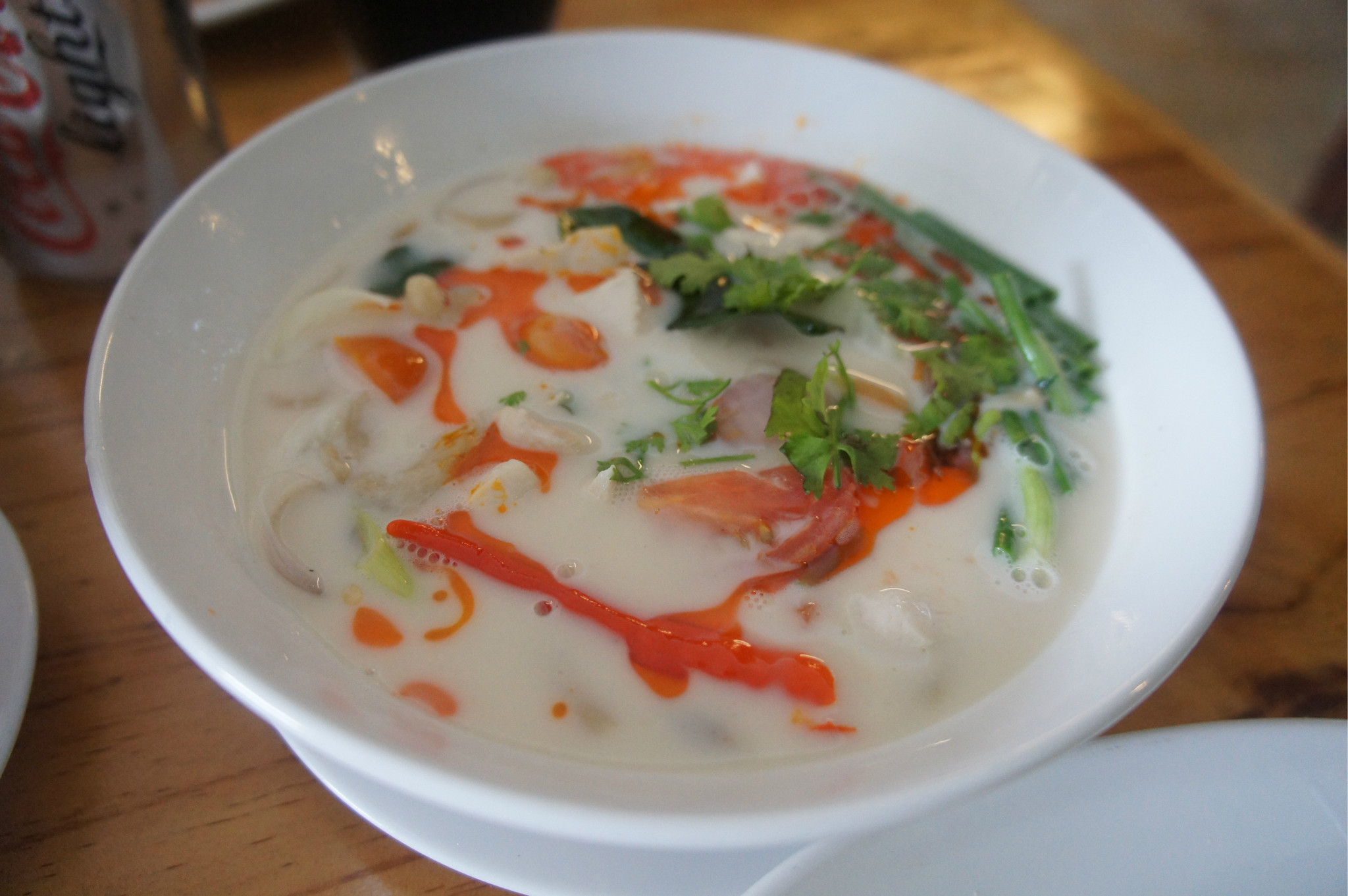 泰北面十分特别,咖喱汤底,配一只大鸡腿。汤里放着宽面,上面铺着一层炸面,还配上一小碟小配料,有小葱,酸萝卜,酸菜,青柠檬。把配料都倒入汤中,青柠檬挤上汁,喜欢还可以加点鱼露,一起搅拌着吃。这样一碗才35B(7块钱),实在是满足呢!