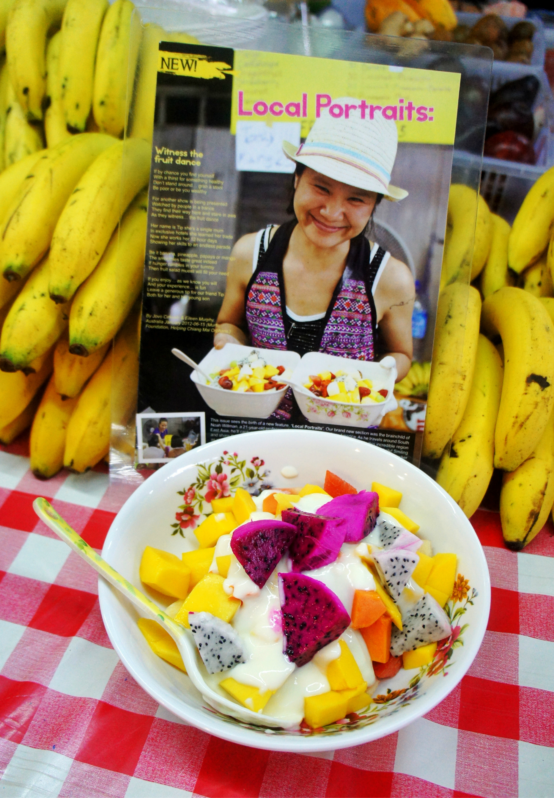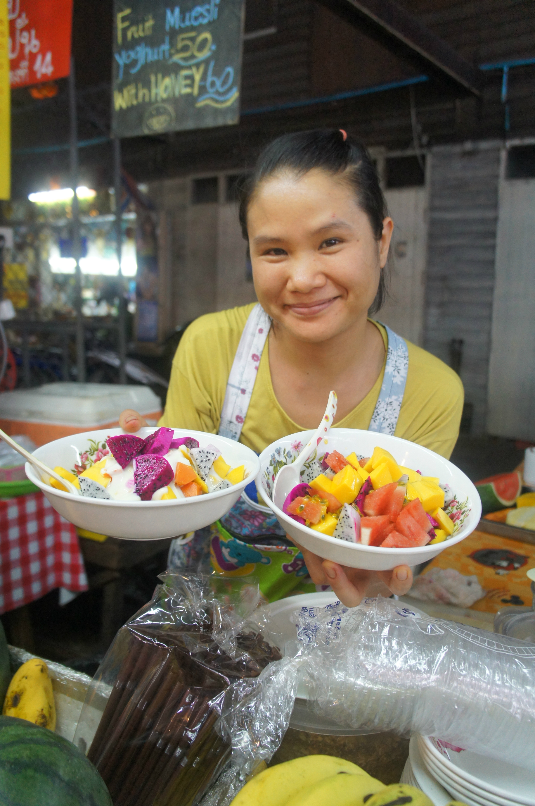 TIP是单亲妈妈,从前在酒店工作,后来辞职带着儿子在这个市场里摆着水果摊,每天工作12小时,用她的热情好客与上佳的水果收买了一众食客的心。不少外国游客都会慕名前来,点一碗水果沙律配酸奶,或是点上一杯混合水果沙冰。