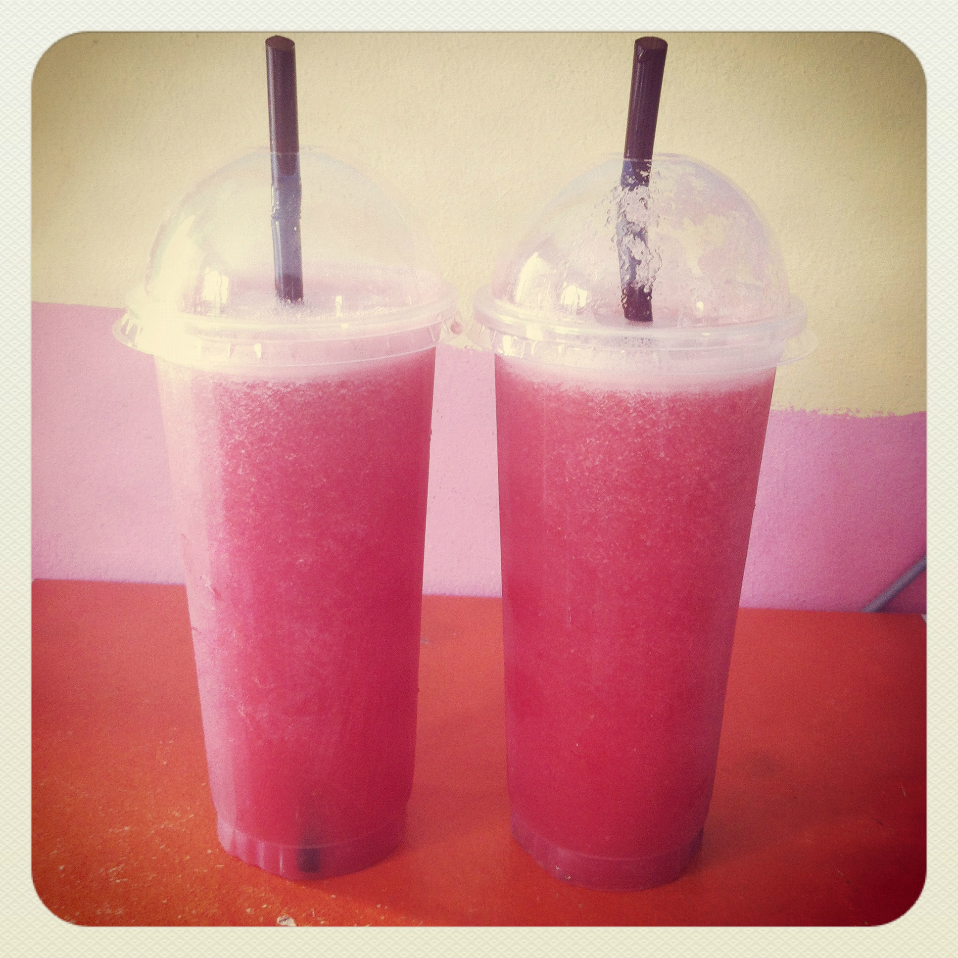 西瓜冰,3块钱一杯,看着她将大半个西瓜切块去皮挖壳,一股脑塞满榨汁机,中途还再添了一大块西瓜,绝对货真价实童叟无欺!