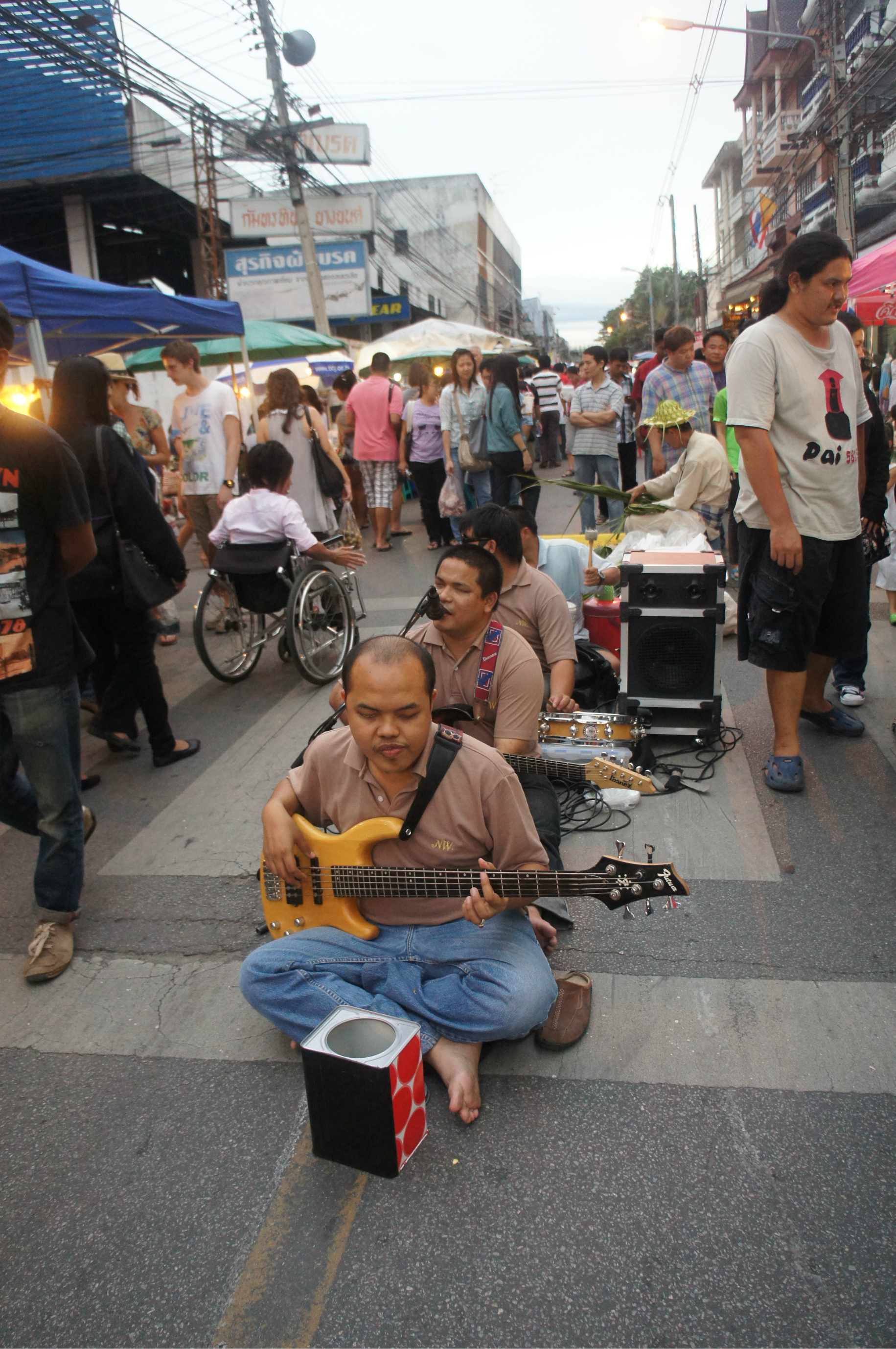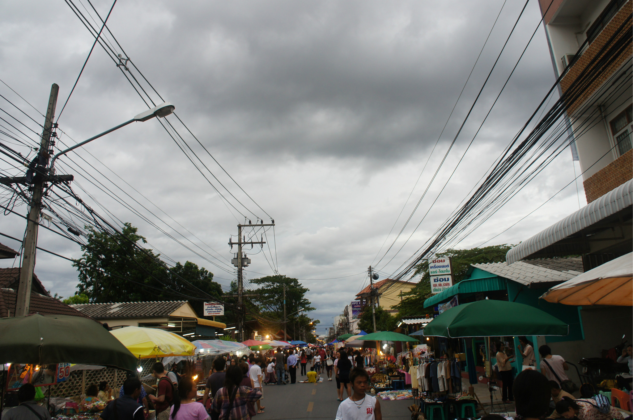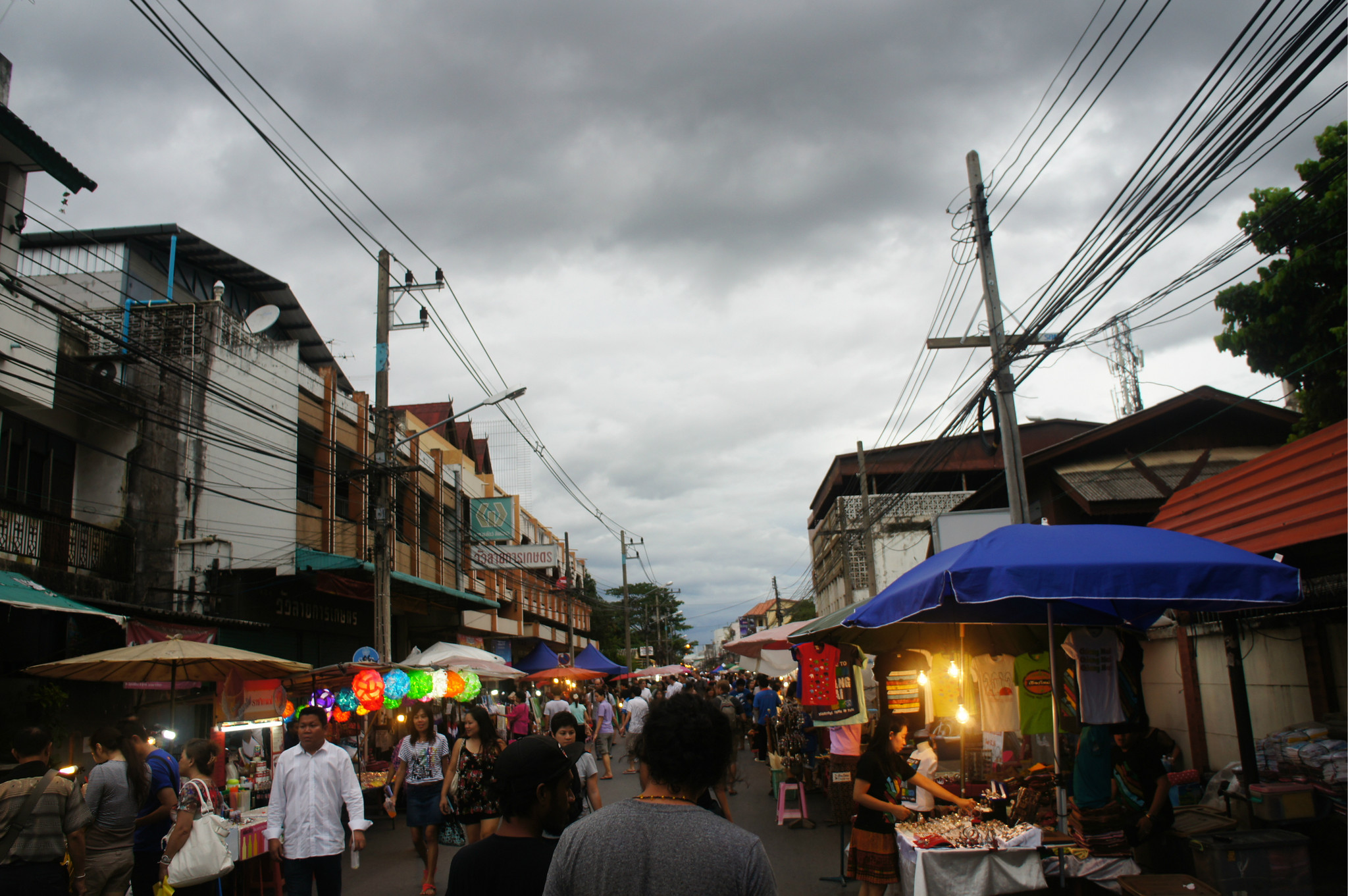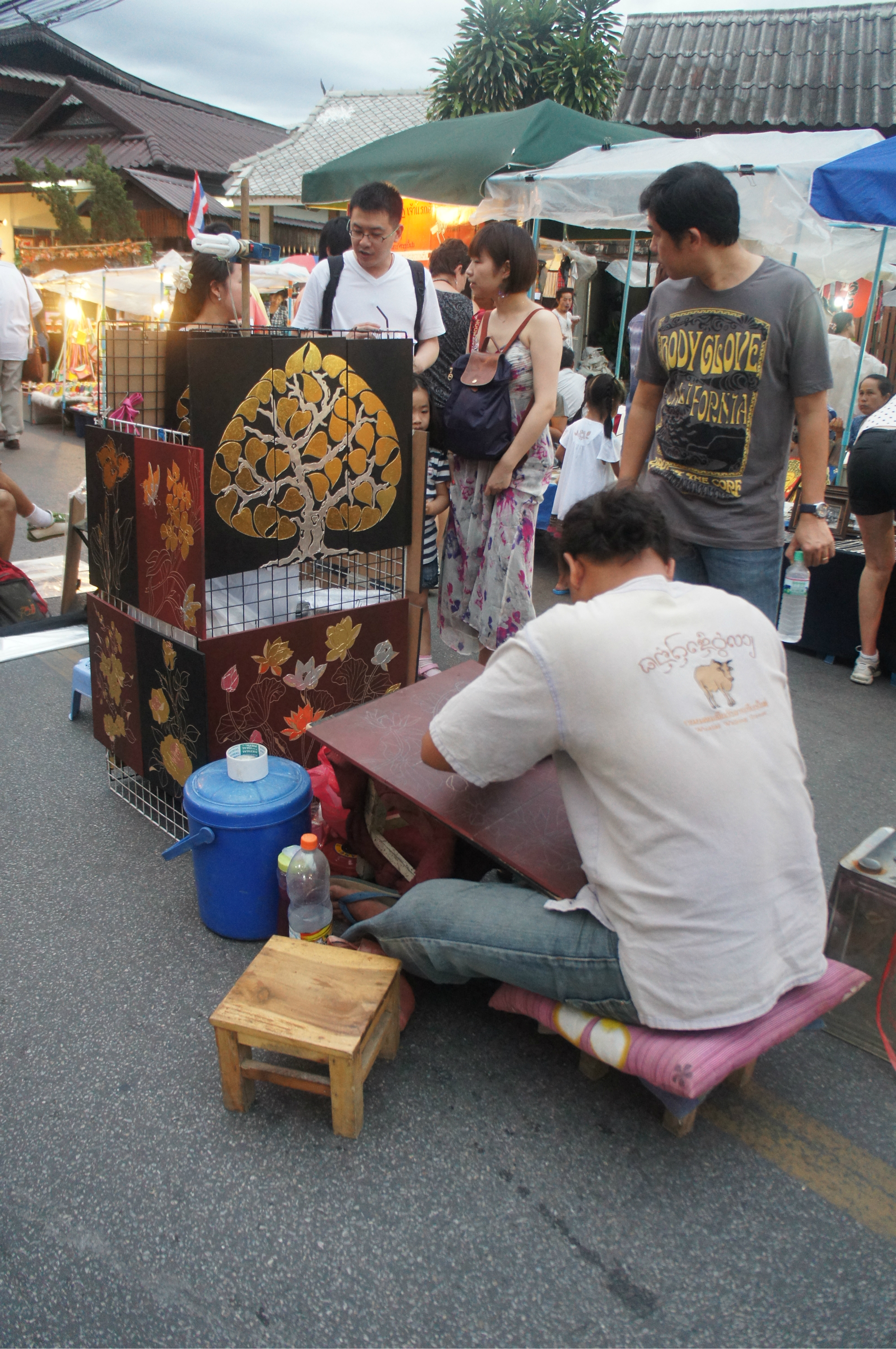 最值得一去的便是周日夜市,从中午开始陆陆续续有人在古城门开始摆摊,到了夜晚,整个清迈 古城的街道都变成了夜市,十分壮观。汽车在这个夜晚会禁止通行,街道两旁摆满了各式各样的小摊店,而寺庙则变成了食堂,里面有各种不同的食物,让游客在这里停歇,填填肚子,又再次闯入大街扫荡。