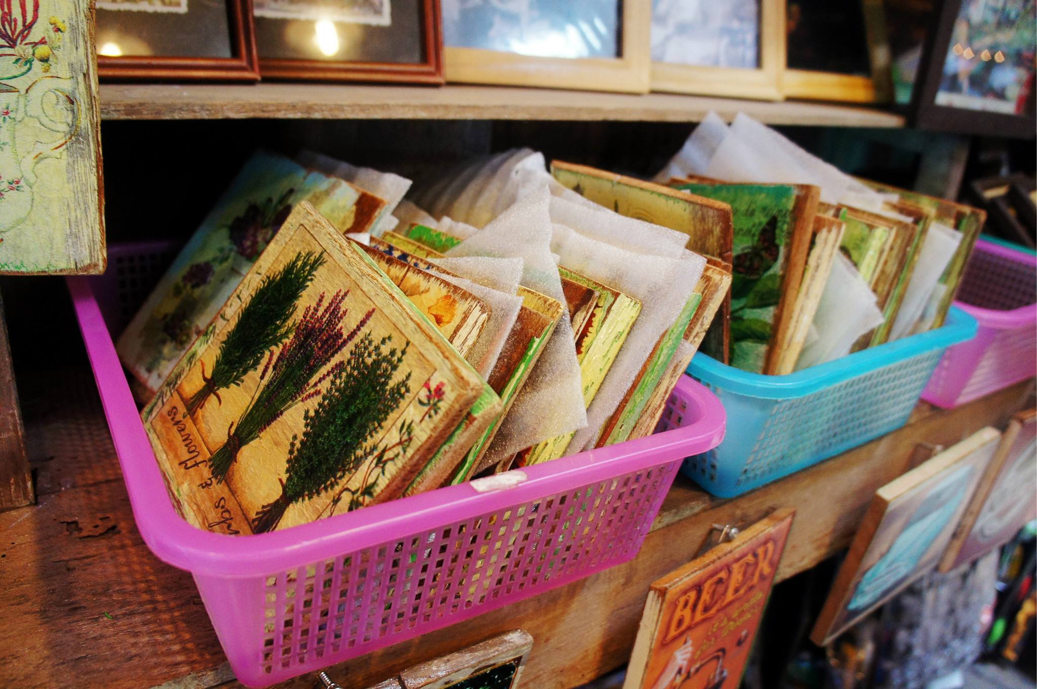 咖啡屋里有很多艺术品和小清新的本子、明信片还有饰物