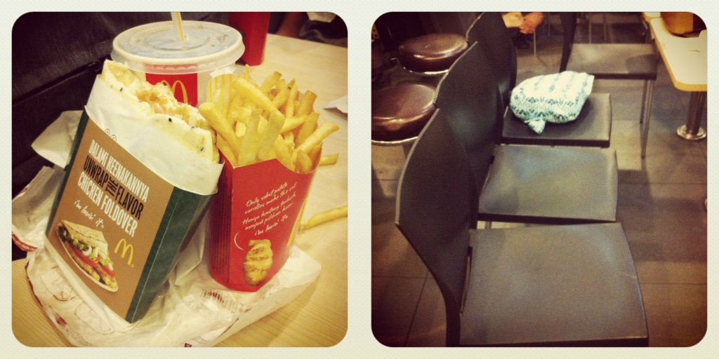 见着皮沙发还有很多,我们便跑过去对面M记买了个当地特色的新产品CHIKEN FOLDOVER当晚餐(还是宵夜?!)。结果回来的时候皮沙发便被速度抢去了,只能和印度 人印尼人还有当地穆斯林抢硬凳子了***