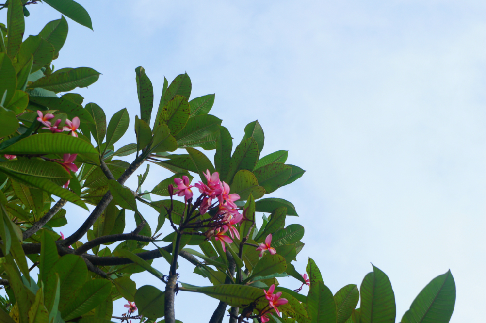 槟城 的街头小巷两旁种了很多鸡蛋花树,我第一次见到这种桃红色花瓣的鸡蛋花树。