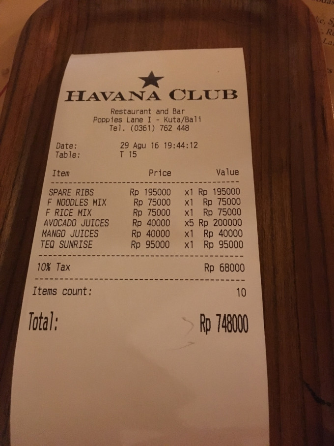 晚上在“HAVANA CLUB”吃,从此开始每餐必点一杯牛油果汁。在巴厘岛经常吃印尼炒饭、炒面,我们都很喜欢吃。