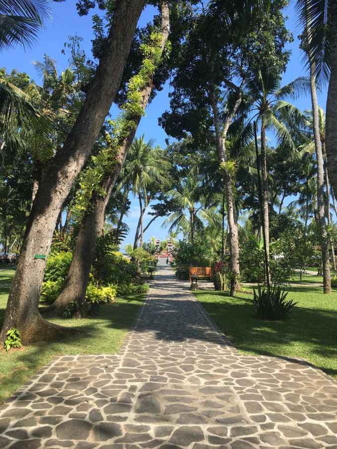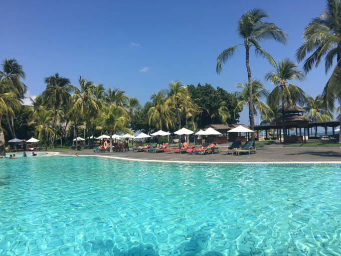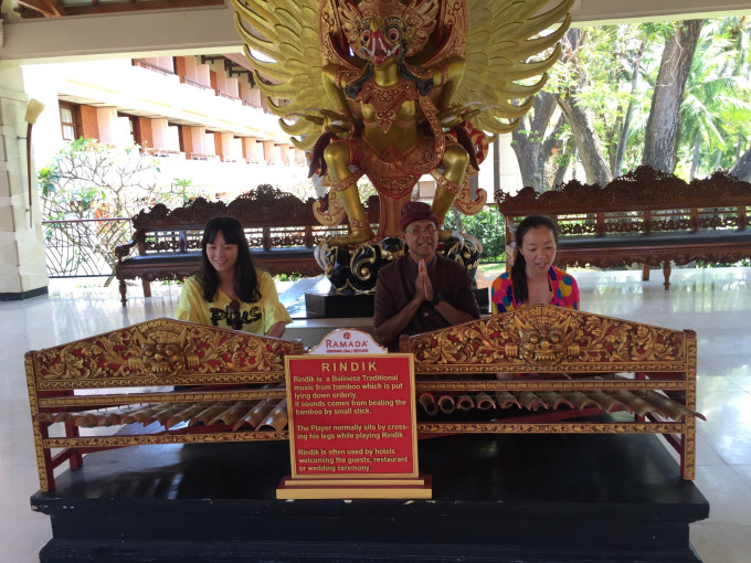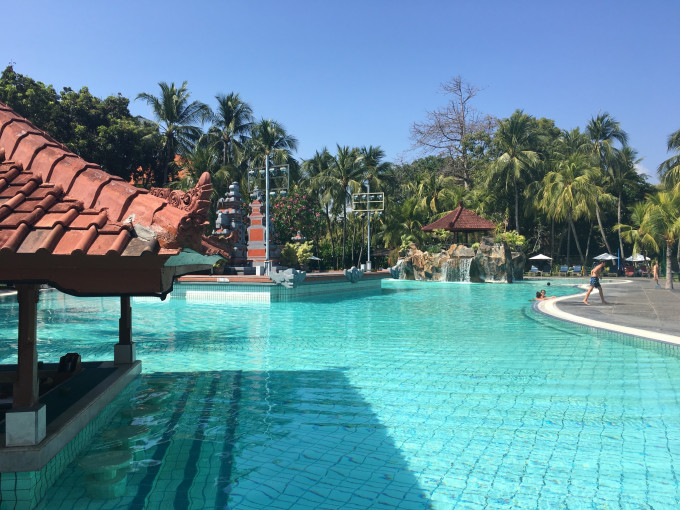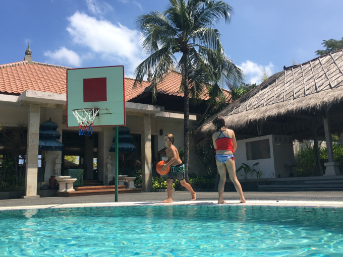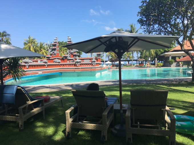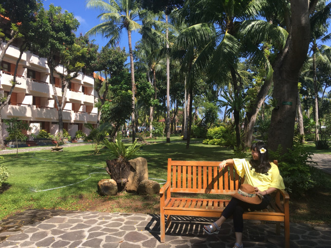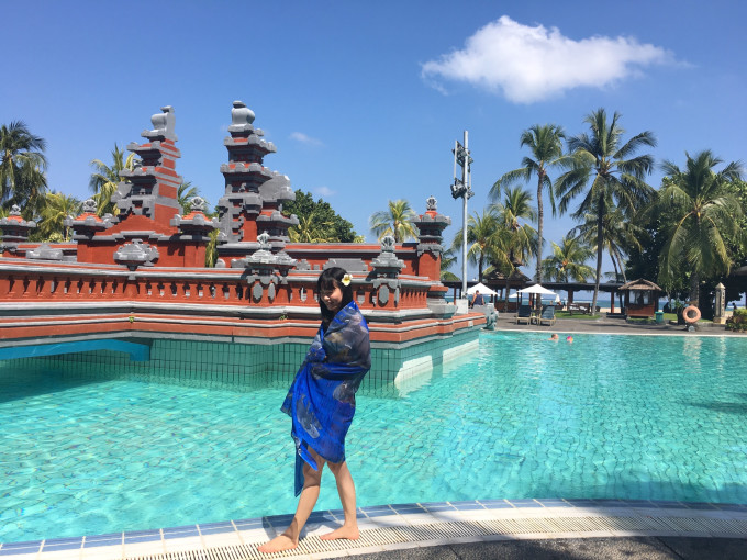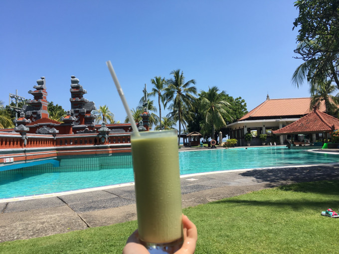 我们住的酒店很舒适,最棒的一点是隔壁是他的姐妹酒店(Ramada Bintang Bali Resort),可以共享设施,泳池、沙滩,从小门走出去就是姐妹店,玩了半天,不会游泳的人玩的起劲,霏儿这个体育老师专业教游泳的,教会了好多人,可是教不会我们。朵爸请我们喝牛油果汁,度假的感觉真好哦。