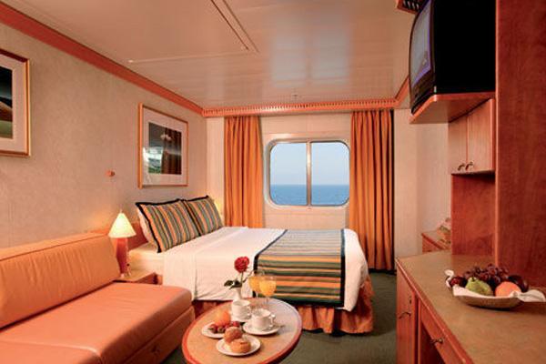 房间内有一扇圆形或方形的窗户可以看见外面的风景,但是窗户不能打开。差不多跟内舱房一样大或者稍大一些,是邮轮中比较鸡肋的舱房。