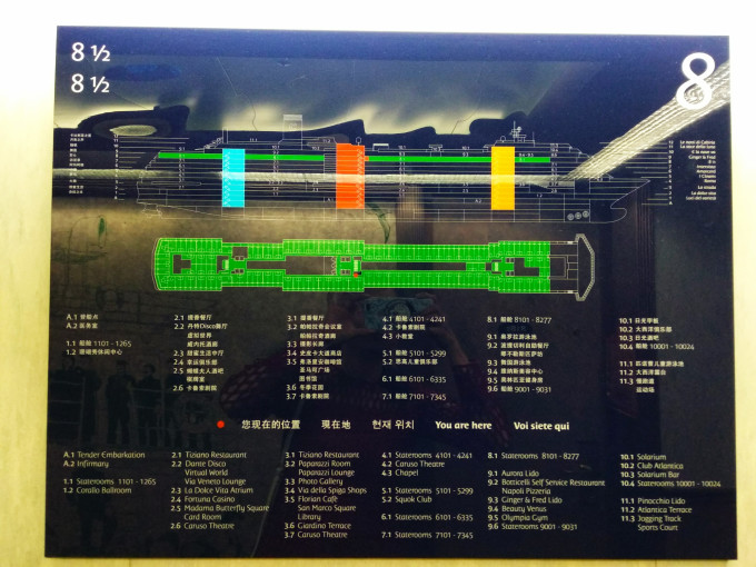 在选择邮轮的过程中,我主要考虑三个因素,首先是航行时间(过年前)/ 出发地点(深圳or广州),其次是邮轮的航线(冬天坐邮轮最好选择去暖和的地方,否则在甲板上吹冷风的感觉可想而知),然后是房间的价格(不差钱的请忽略)。我比较了年前深圳出港的邮轮,觉得歌诗达大西洋号5晚6天的航线是最合适我们的。