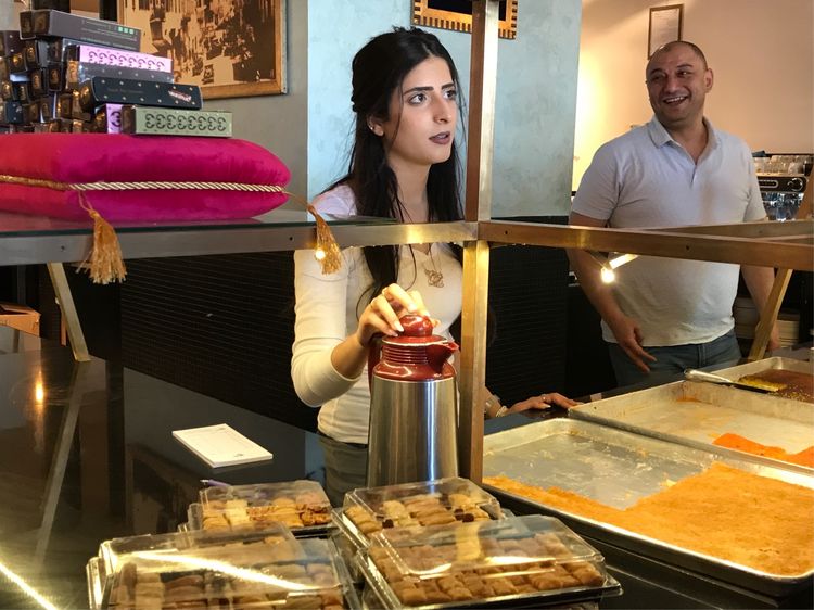 导游带我们来到一家蛋糕店,她说,这家店的蛋糕非常好吃,店员拿出蛋糕让我们品尝,的确很好吃。