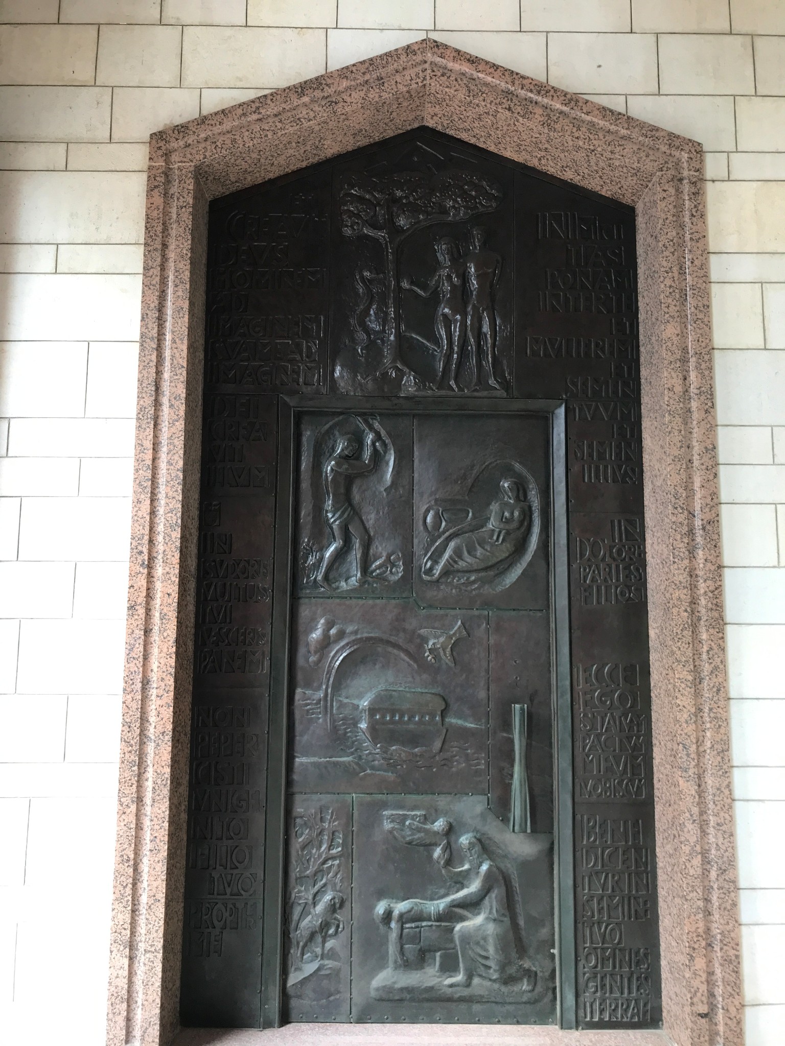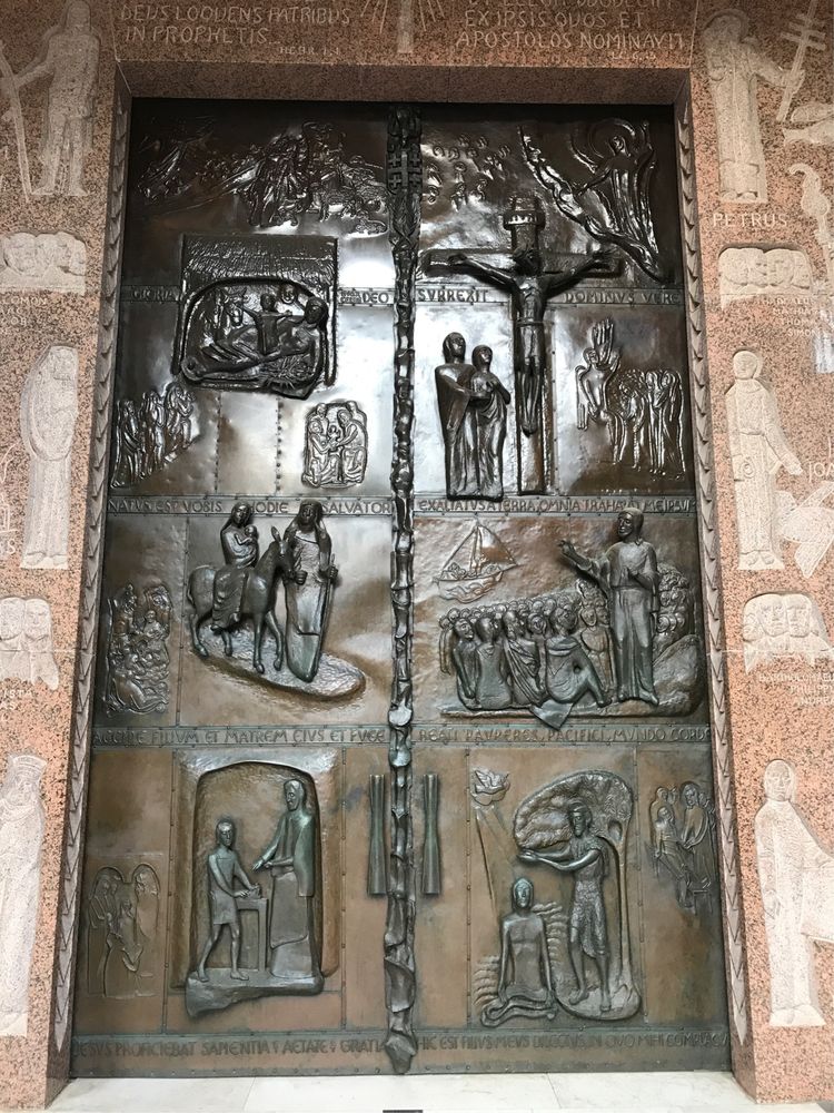 铸铜大门上的浮雕记录着,玛利亚受孕、身怀六甲时,迁往伯利恒申报户口、诞下耶稣、耶稣学艺、传经、受难、受洗、重生的全过程。