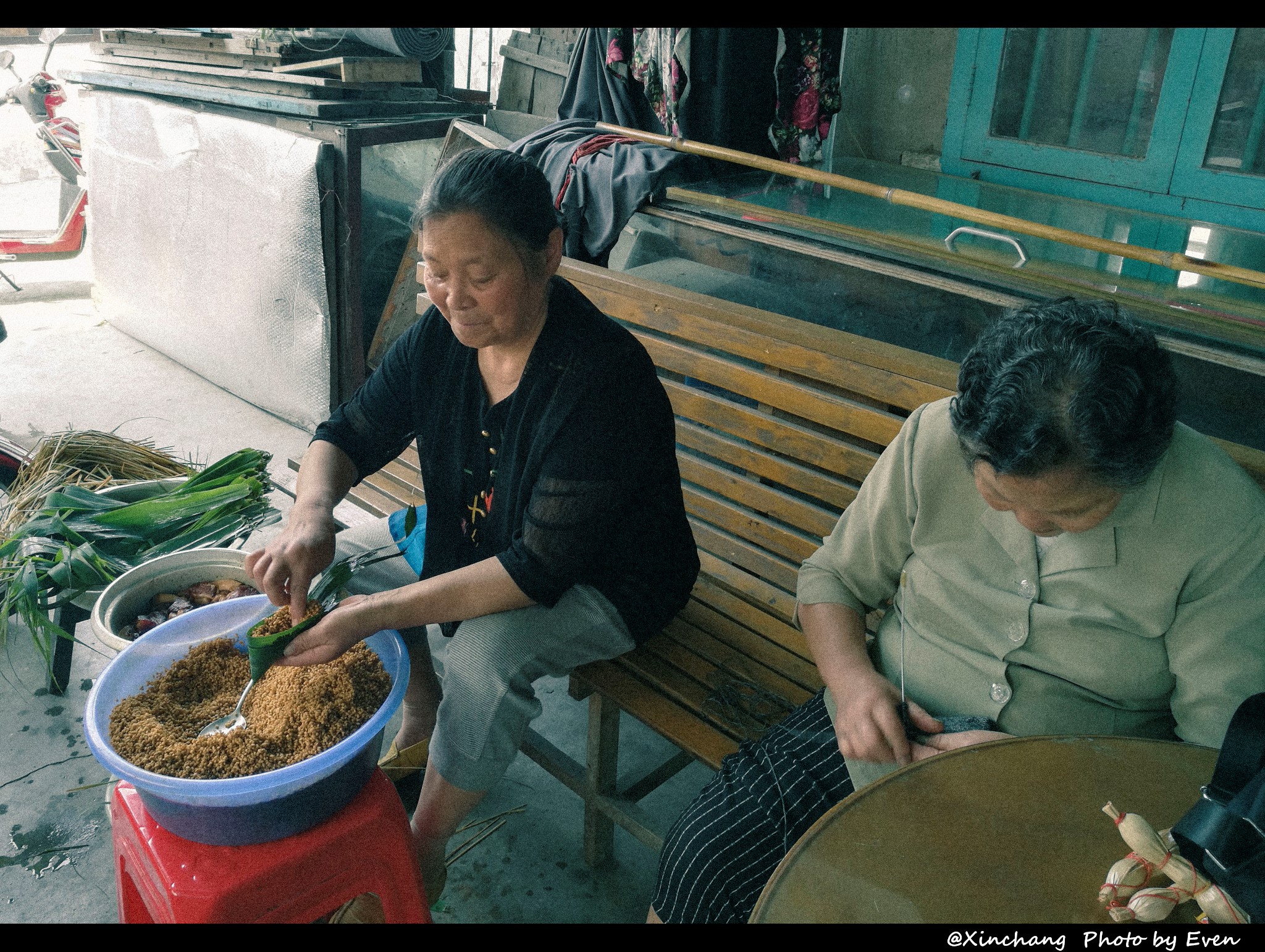 屋里的戏曲悠扬,挤不下了,坐在门口听也无妨。更有边听戏曲边织毛衣包粽子的,两不耽误。