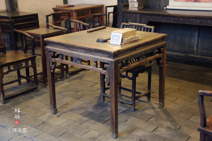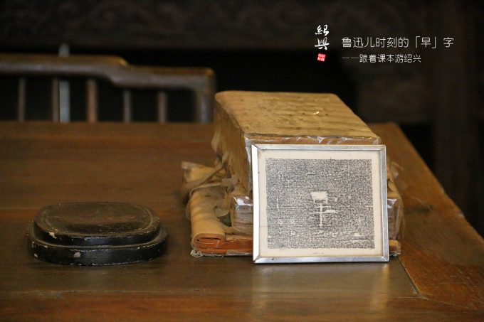 书屋的正中央有一张四方的八仙桌,上面搁着砚台和戒尺,右侧是一摞厚重的古书,有意思的是书前摆着一副小画框,里面清晰可见一个拓印的“早”字。