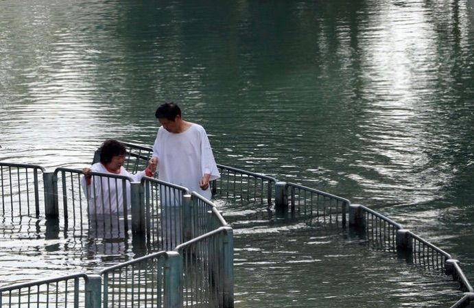 河边有专为信徒念诵圣经的台阶,河里有几道金属做的扶栏,供受洗的信徒们使用。