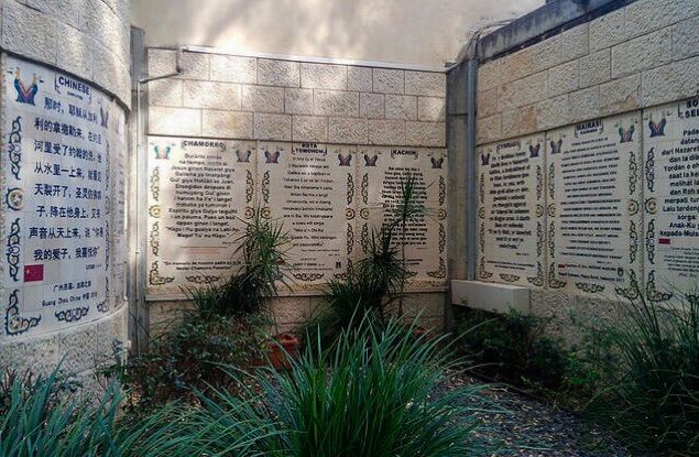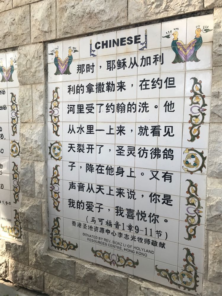 约旦河洗礼处河岸上,有一面特别的墙,墙上一块块琉璃瓦烧成的、用各国文字刻写的马可福音中耶稣受洗的篇章。这段中文字是一位香港神父捐献的。