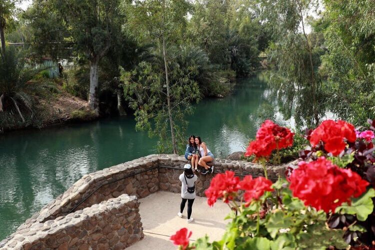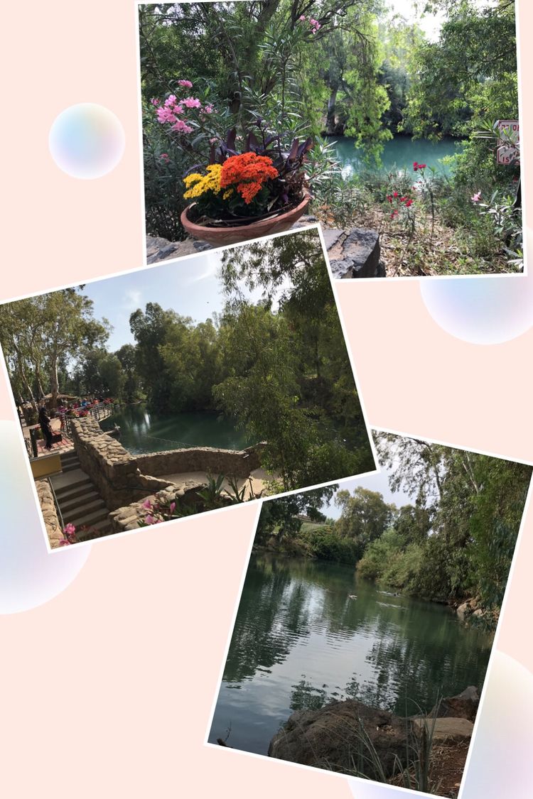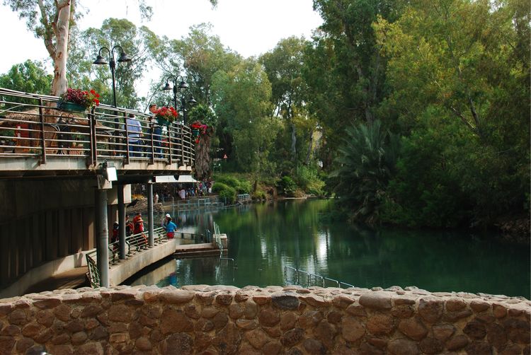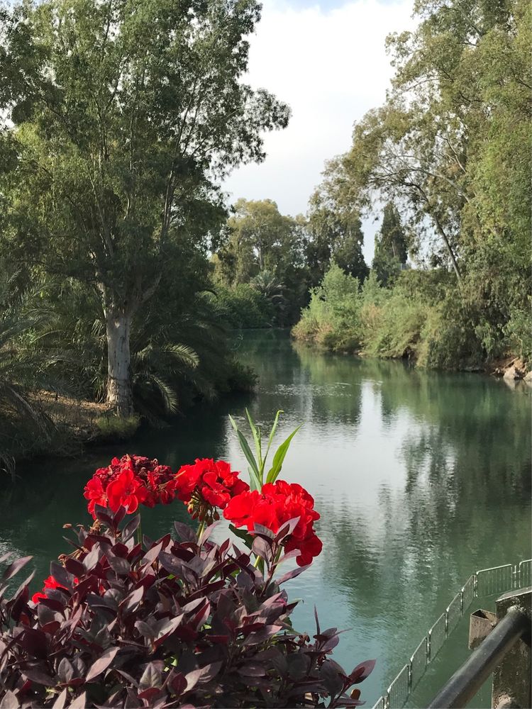 约旦河是条安静的小河,远不及耶稣时代那样宽阔。洗礼圣址两岸,桉树围绕,花藤成片,沿河的栏杆上摆置了许多盆栽花卉。