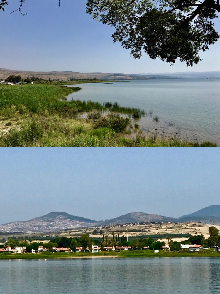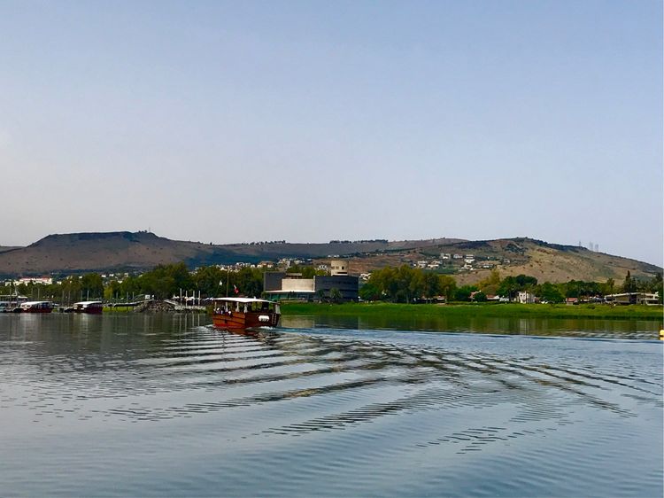 加利利湖镶嵌在加利利山和戈兰高地夹峙的谷地中,绵延起伏的山脉环抱着一泓天青的湖水,阳光灿烂中的湖水泛着粼粼波光,跳入人们的眼帘。约旦河汇集了赫尔蒙山的溪流雪水,自北向南,象一条银链将加利利湖和死海这两颗夺目的宝石串连在了一起,仿佛似天使的珠串,不慎遗失在人间。